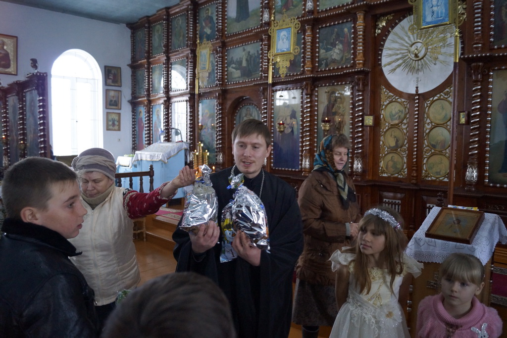По окончании представления настоятель храма иерей Димитрий Бураков вручил всем ученикам рождественские подарки.