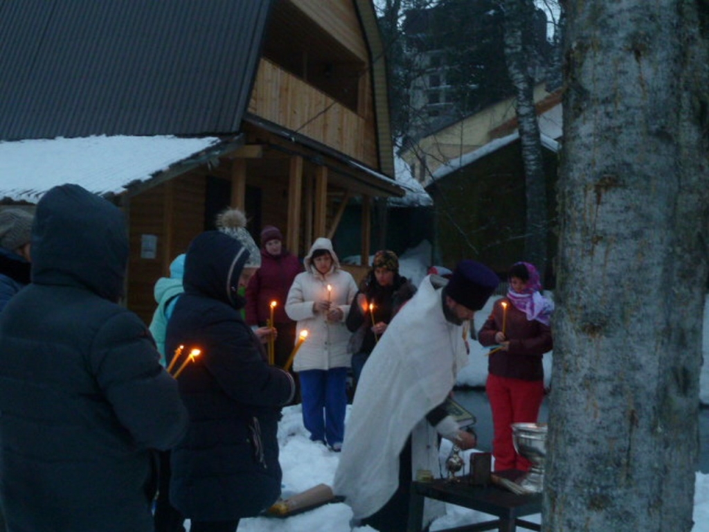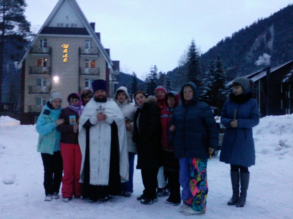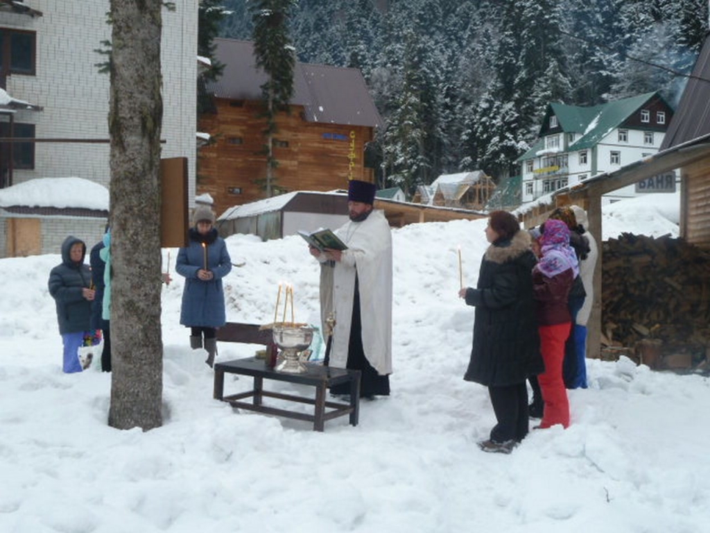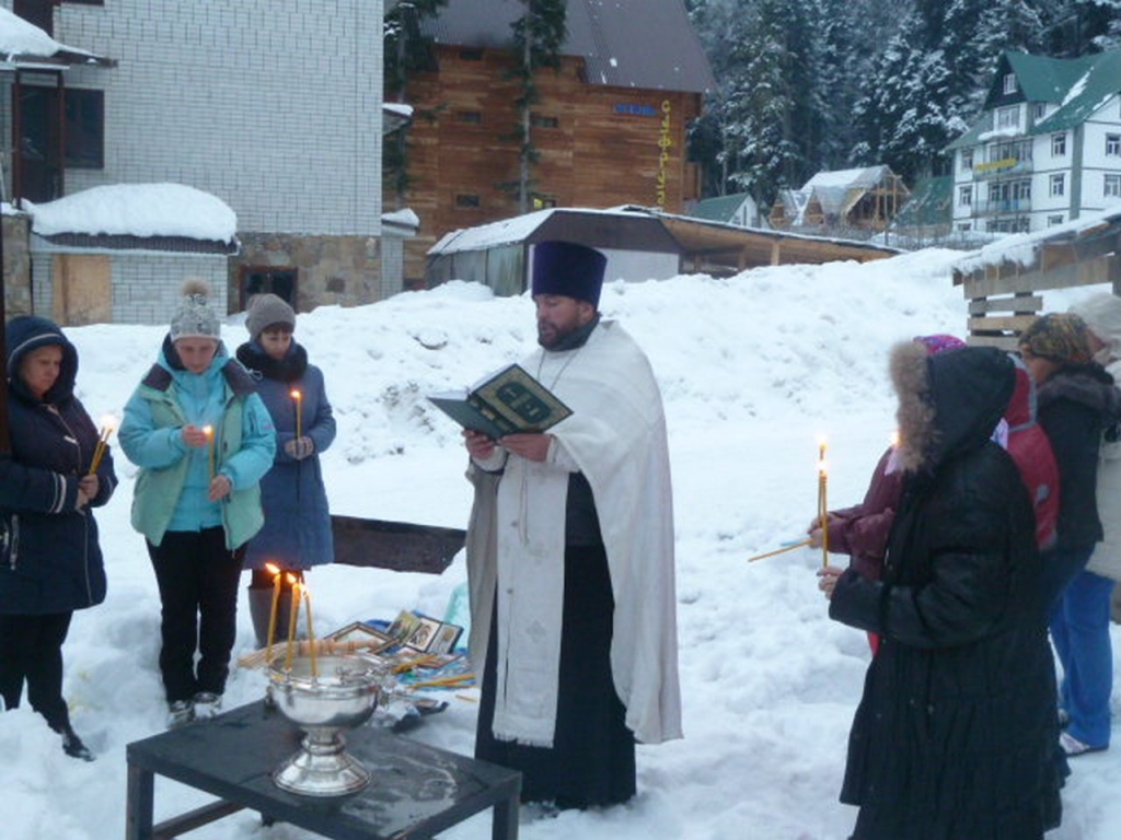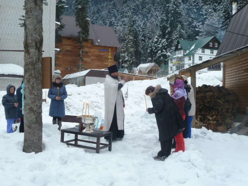 В Крещенский сочельник чин Великого освящения воды совершили в общине в память священномученика Вениамина митрополита Петроградского. Настоятель общины иерей Сергий Фоменко освятил воду для жителей и гостей поселка Домбай.
