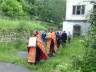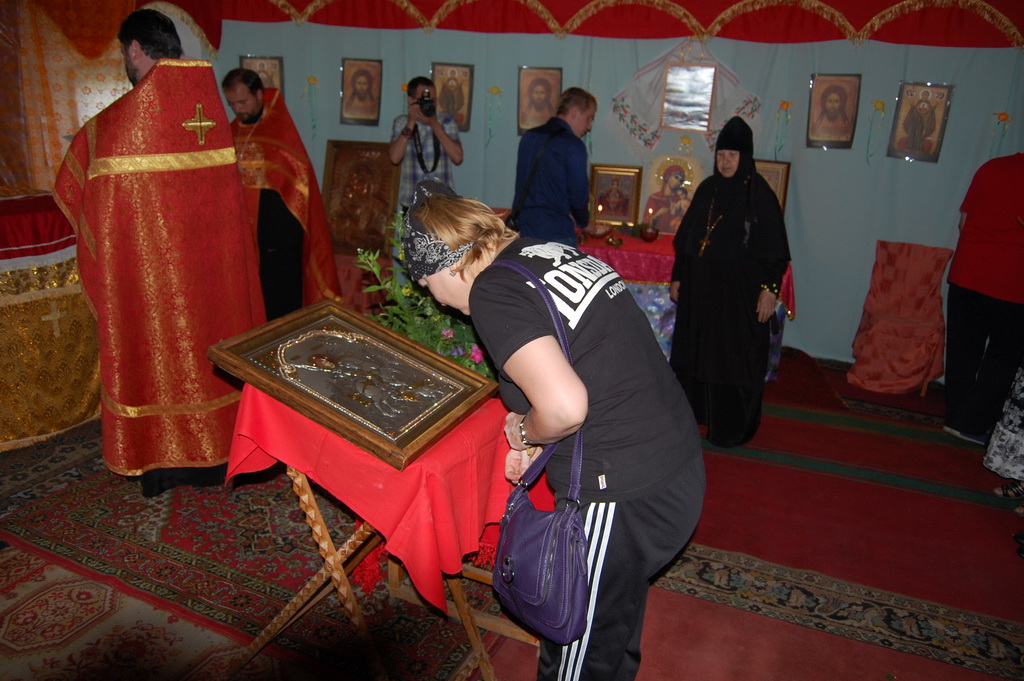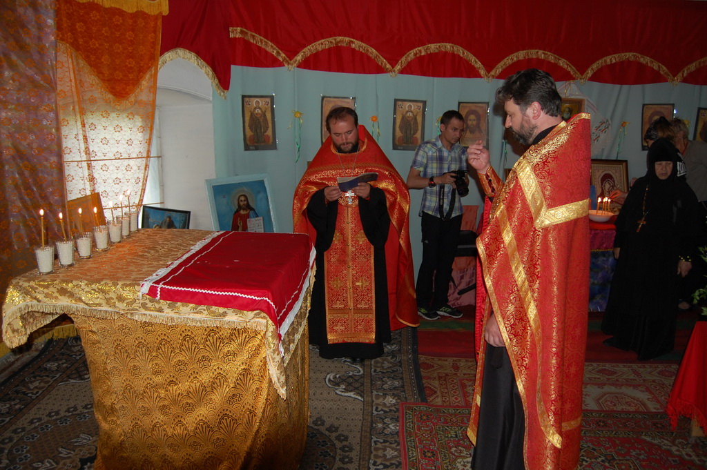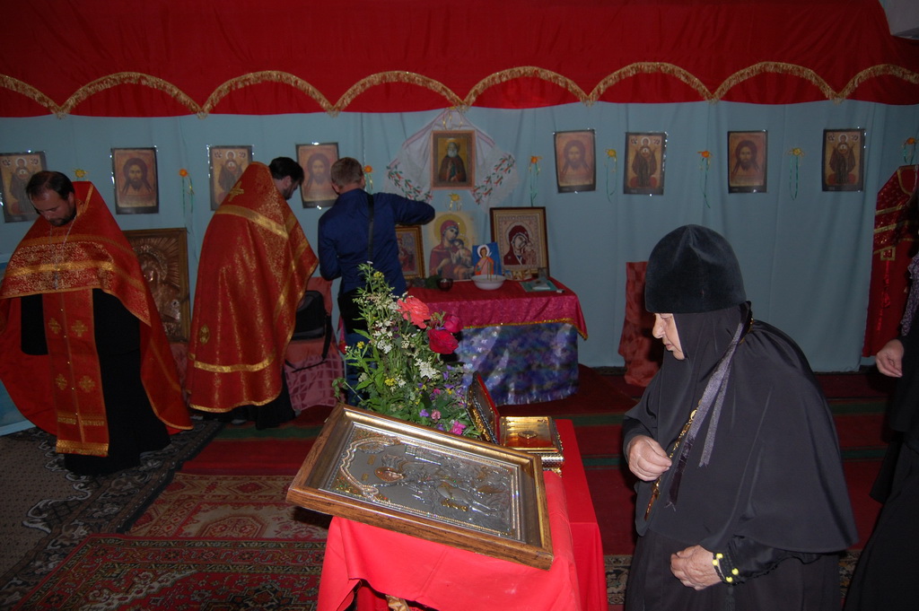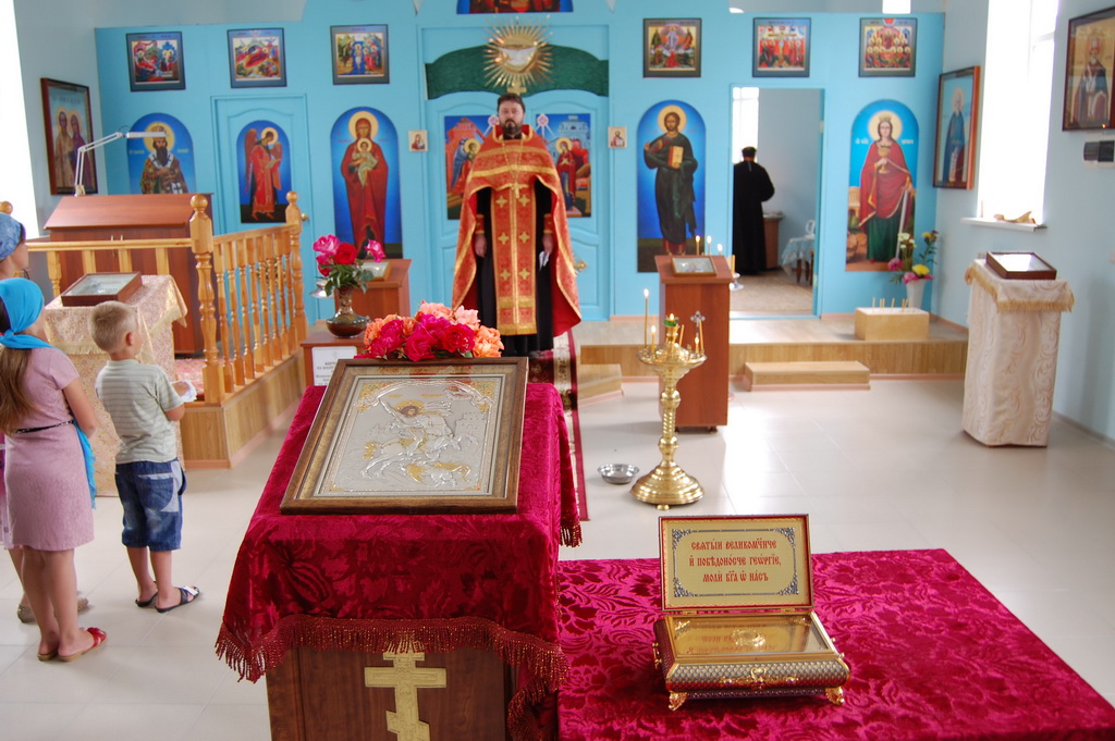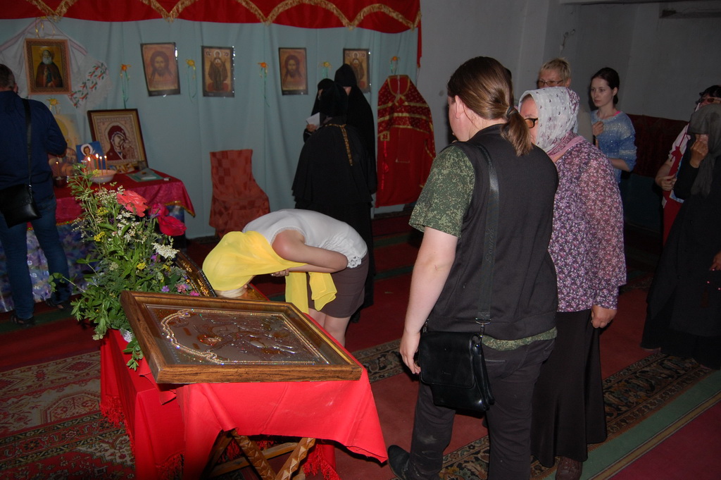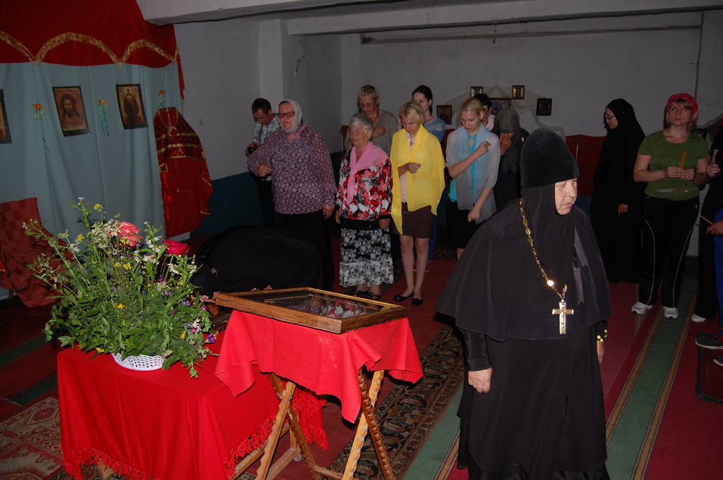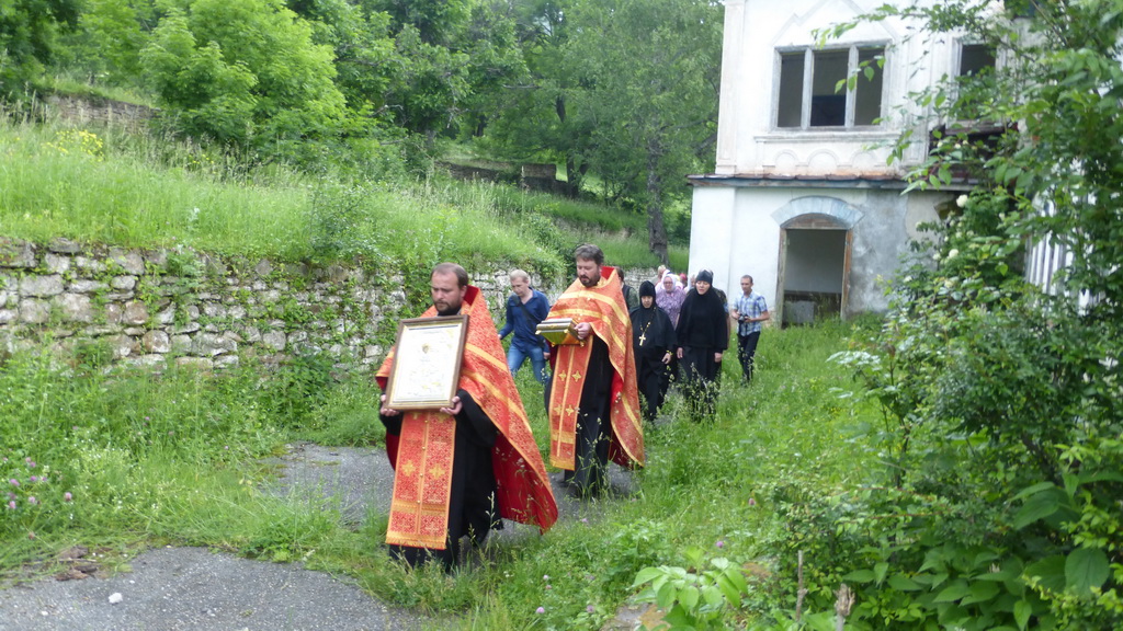 Крестный ход встречали сестры во главе с игуменьей Антонией (Бобылевой). В Домовом храме игуменского корпуса было совершено молебное пение великомученику Георгию. После окончания молебна, святыню обнесли вокруг храма. У могилы игуменьи монастыря Раисы была совершена панихида.