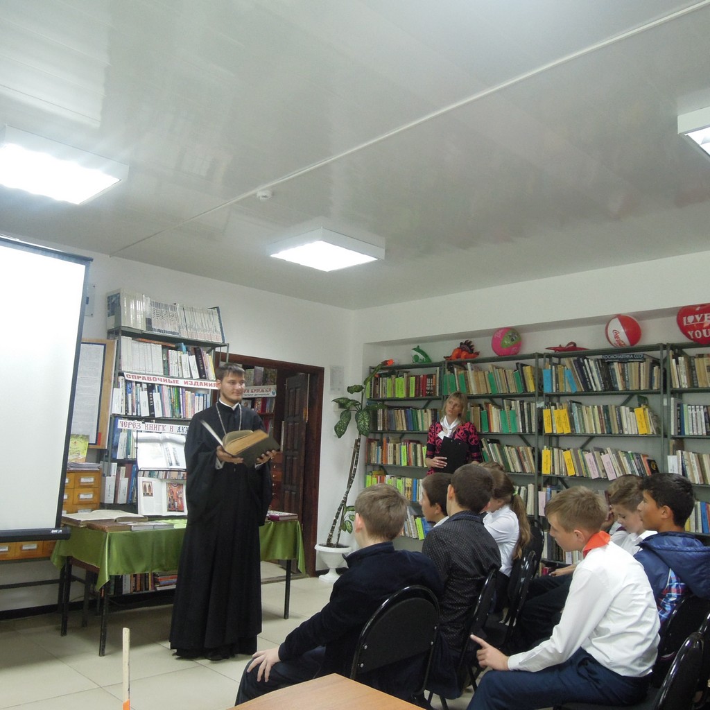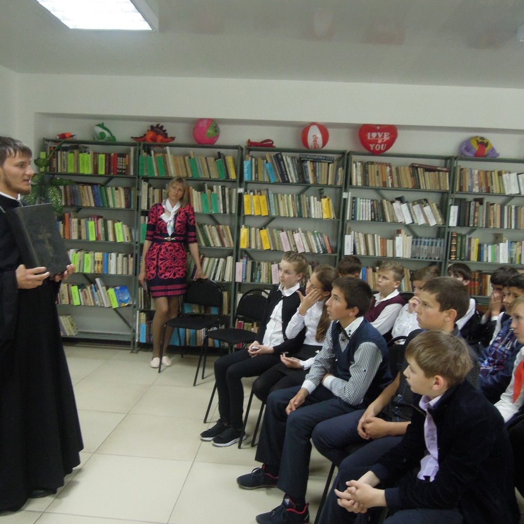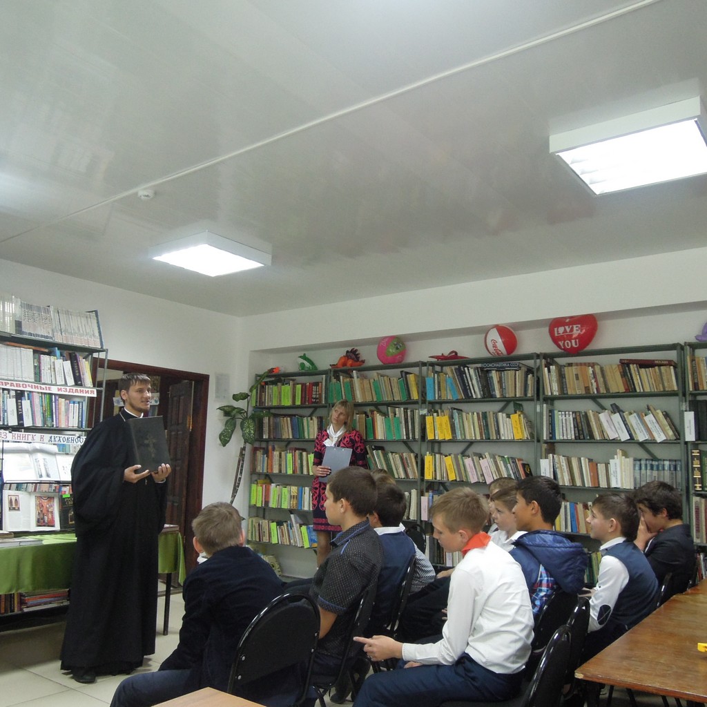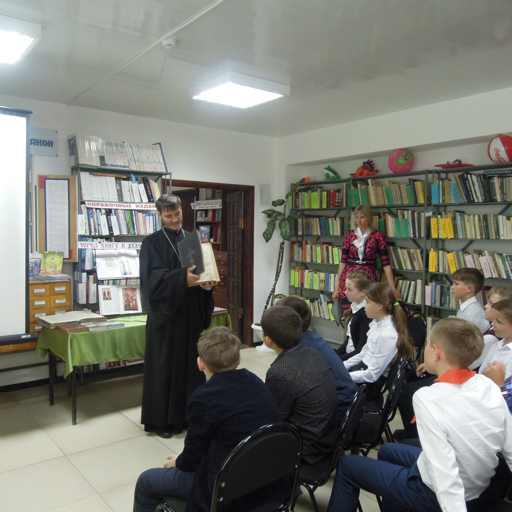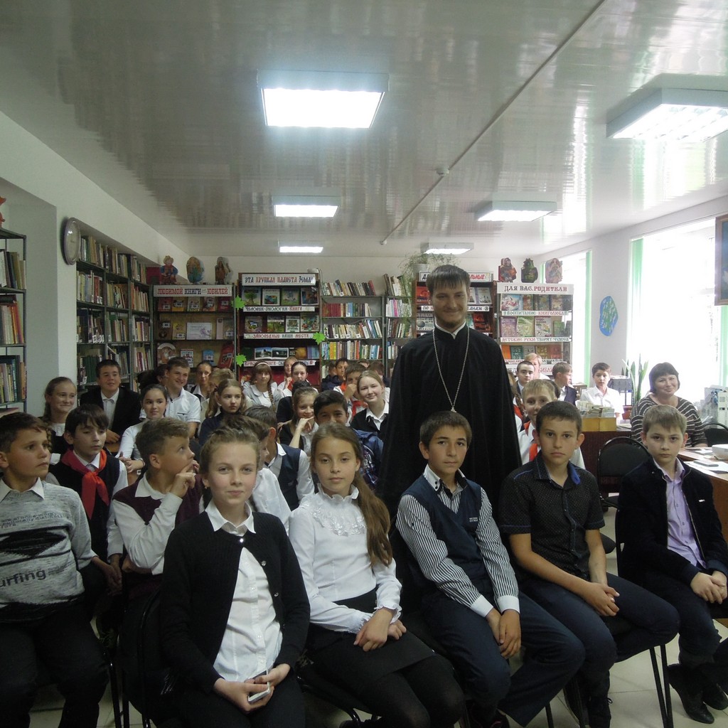 Познавательный урок «Путь через книгу к духовности» для учащихся 6-х классов МКОУ «СОШ №1 станицы Зеленчукской» подготовили и провели работники детского отдела библиотеки во главе с заведующей Ольгой Селеной, и штатный священник Петропавловского храма станицы Зеленчукской иерей Алексий Гурин. Всего на занятии присутствовало немногим более шестидесяти человек.