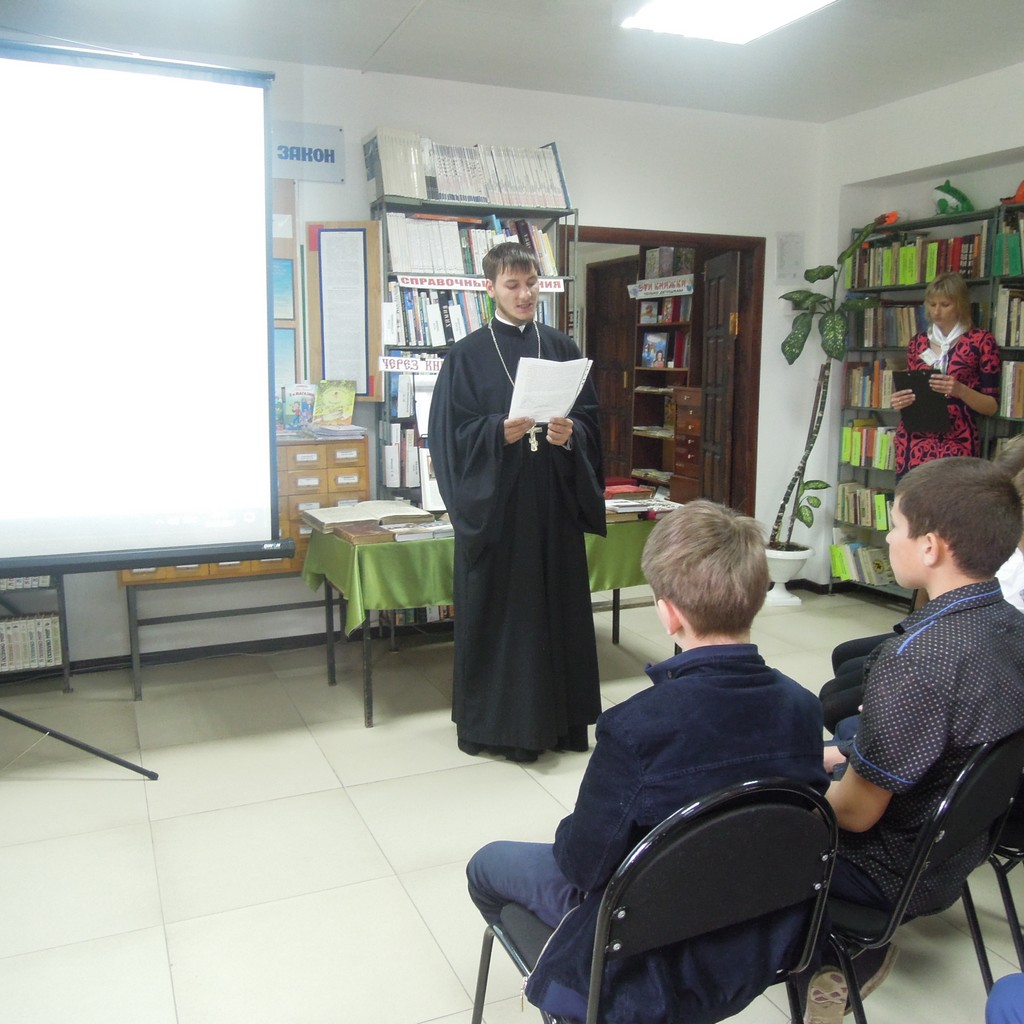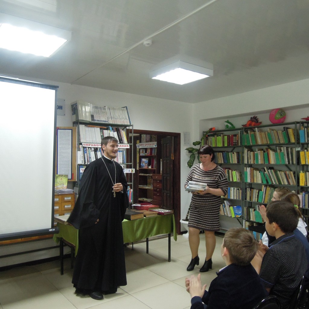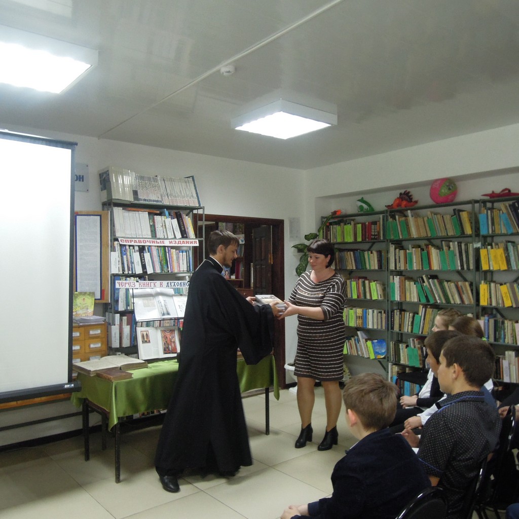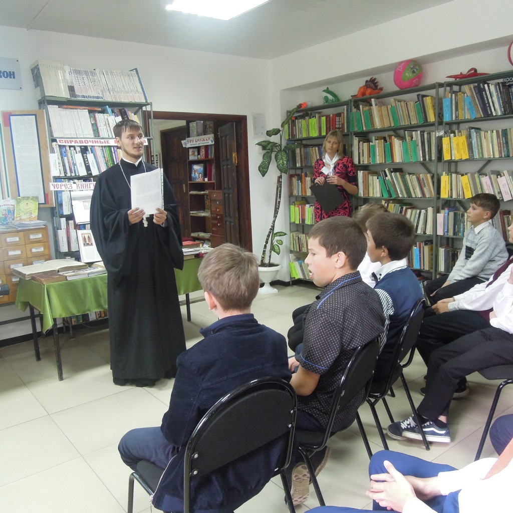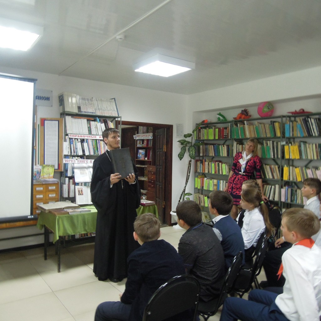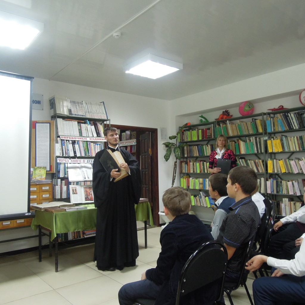 Познавательный урок «Путь через книгу к духовности» для учащихся 6-х классов МКОУ «СОШ №1 станицы Зеленчукской» подготовили и провели работники детского отдела библиотеки во главе с заведующей Ольгой Селеной, и штатный священник Петропавловского храма станицы Зеленчукской иерей Алексий Гурин. Всего на занятии присутствовало немногим более шестидесяти человек.
