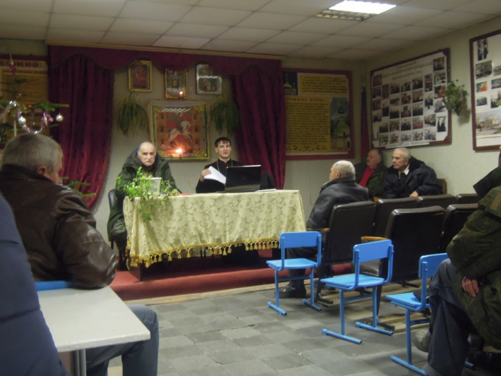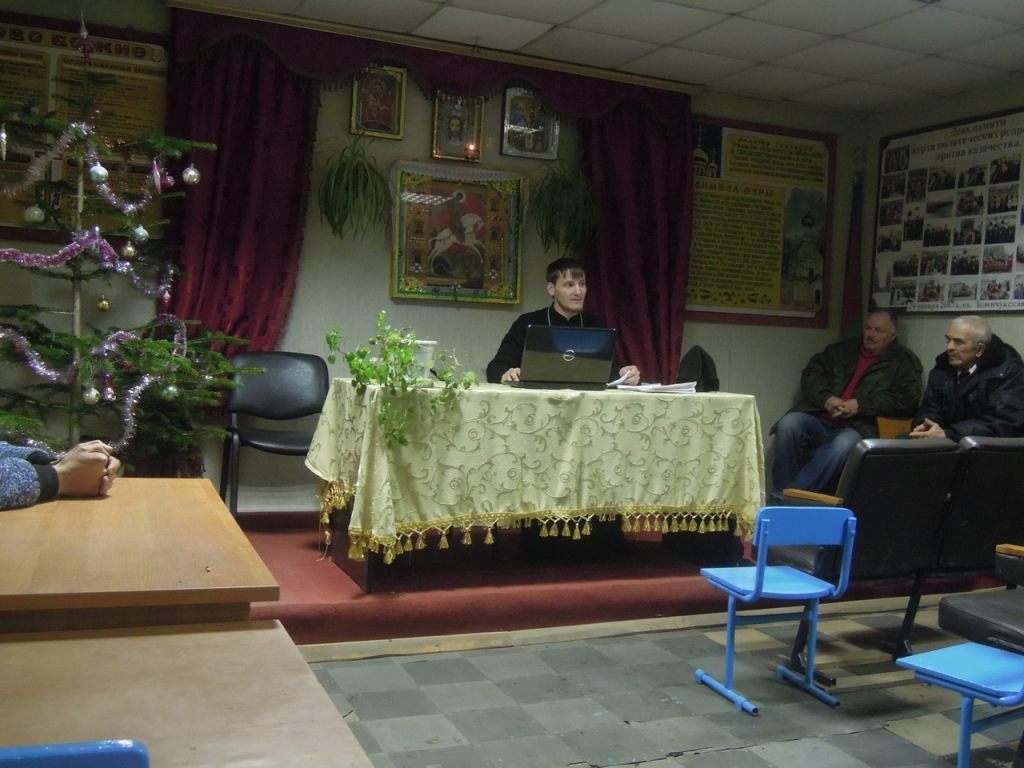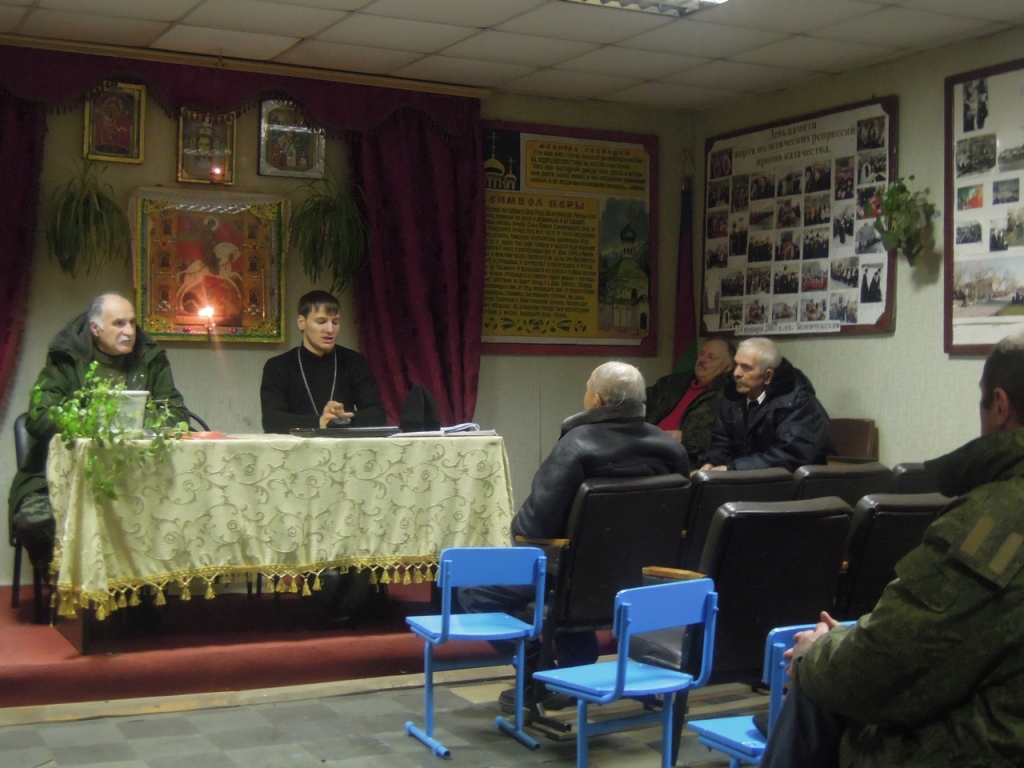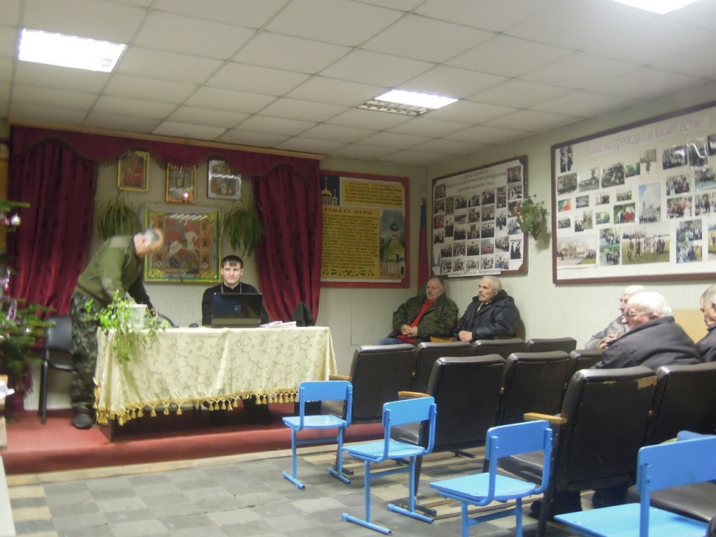 В Зеленчукском обществе стало доброй традицией присутствие на заседании правления штатного священника Петропавловского храма станицы Зеленчукской иерея Алексия Гурина.Каждую неделю, участвуя в работе правления, священнослужитель проводит со станичниками беседы на темы изъяснения Священного Писания, истории Церкви, церковного устава и Богослужения.
