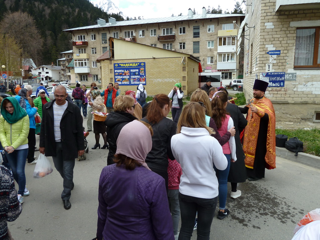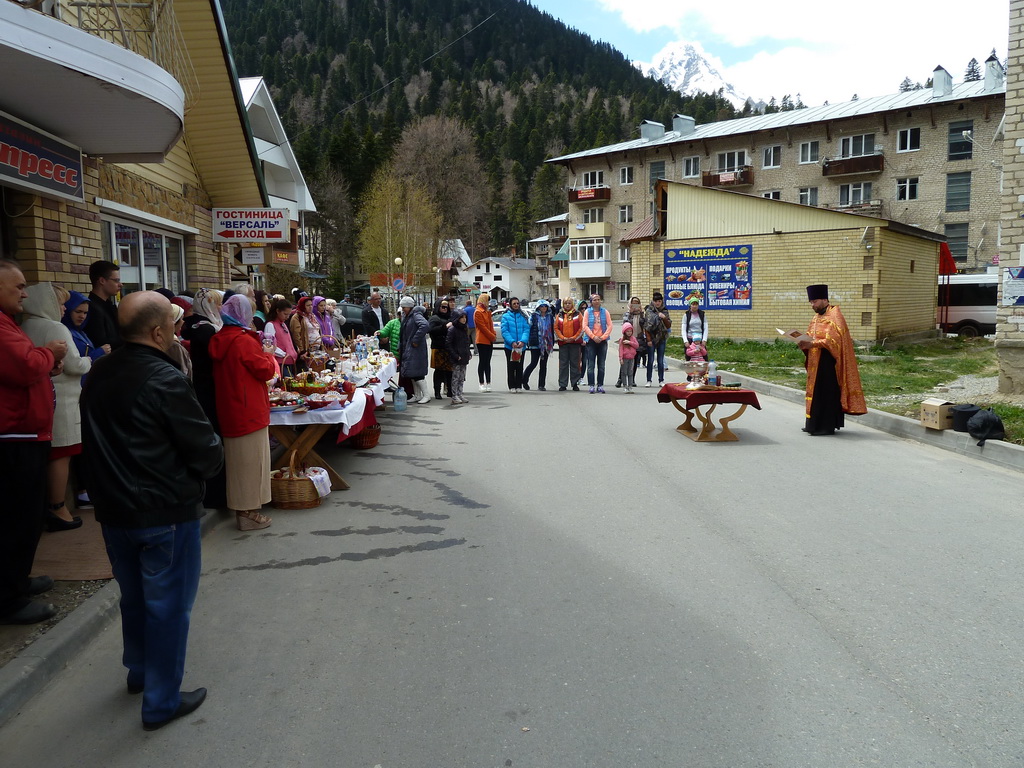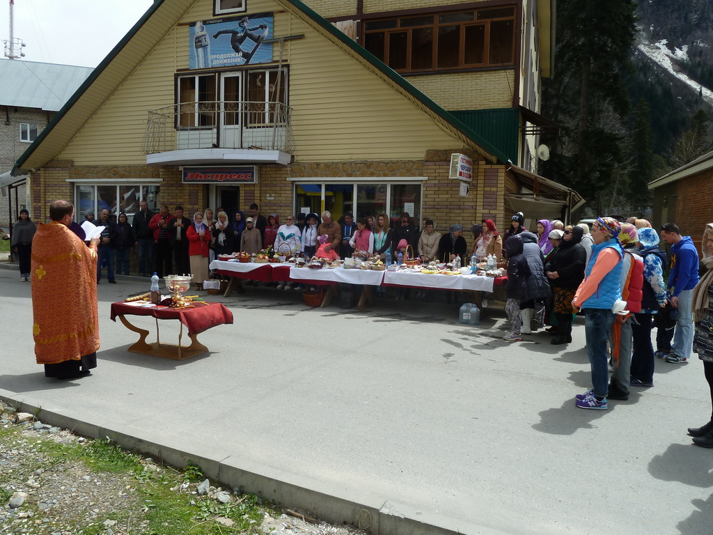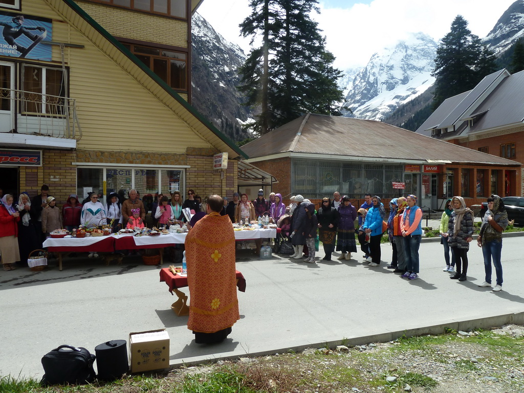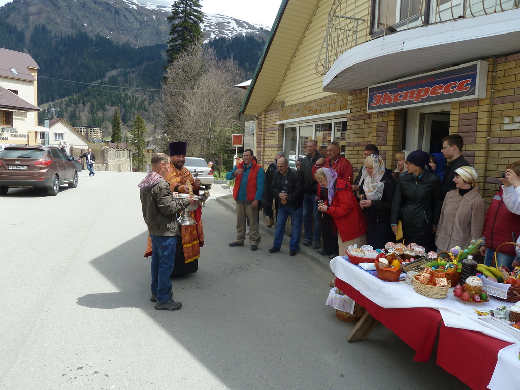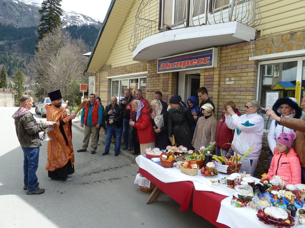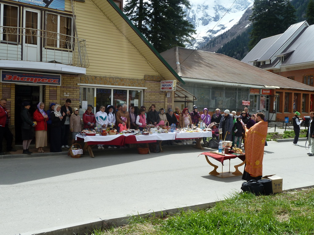 В день Светлого Христова Воскресения православные верующие общины в память священномученика Вениамина митрополита Петроградского поселка Домбай собрались, чтобы молитвенно восславить Воскресшего Христа. По окончании пасхального молебна, который совершил настоятель общины иерей Сергий Фоменко, были окроплены святой водой праздничные приношения жителей и гостей поселка Домбай.