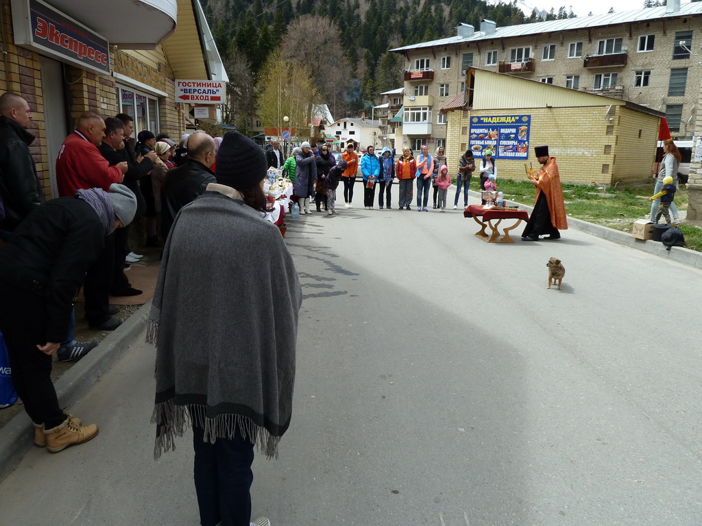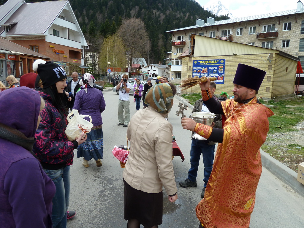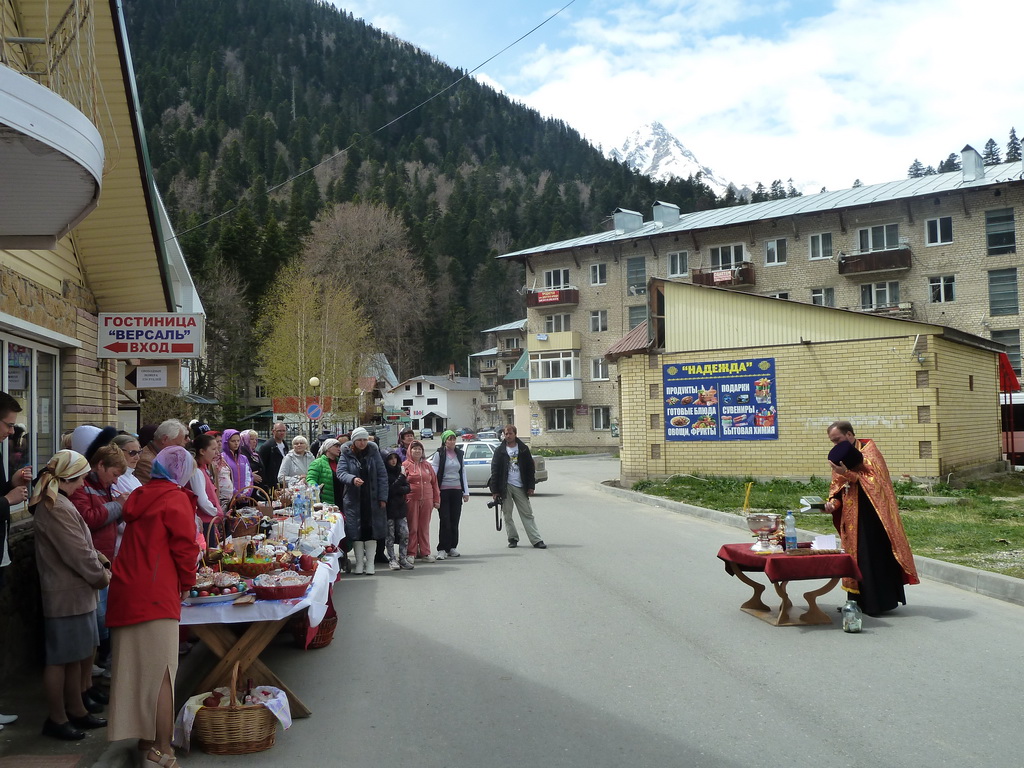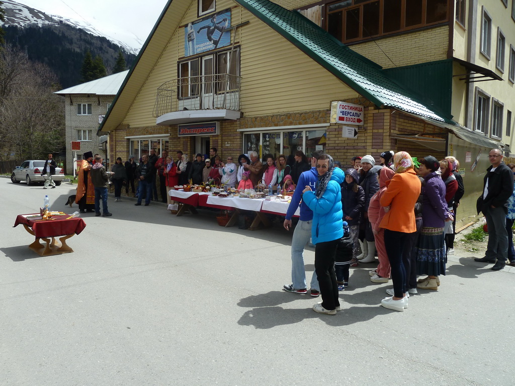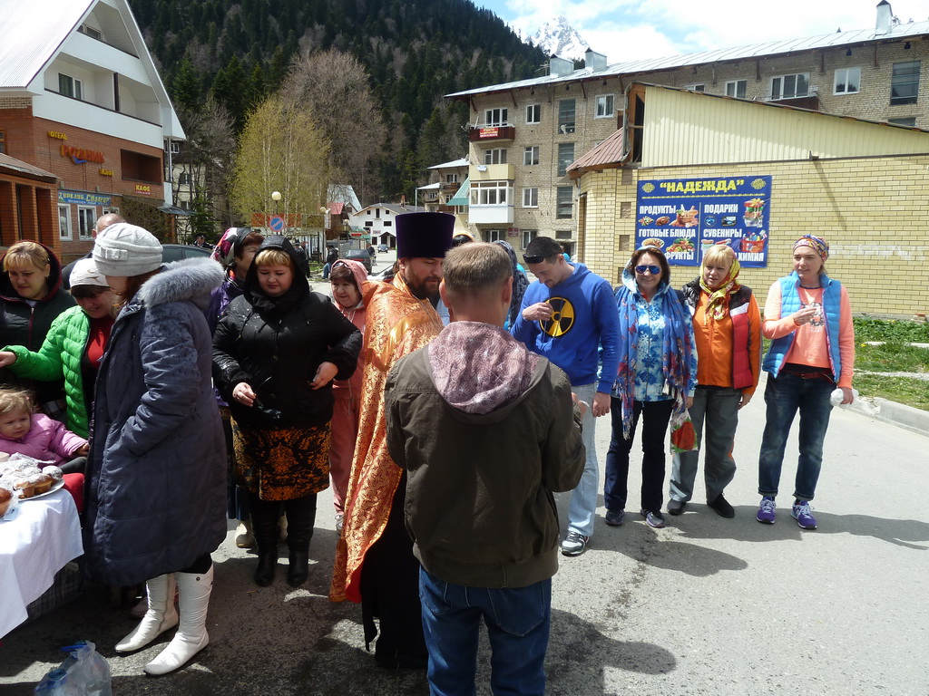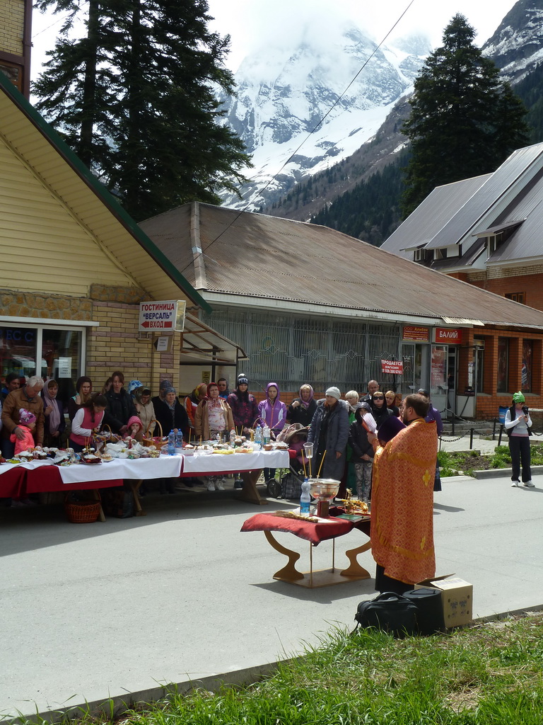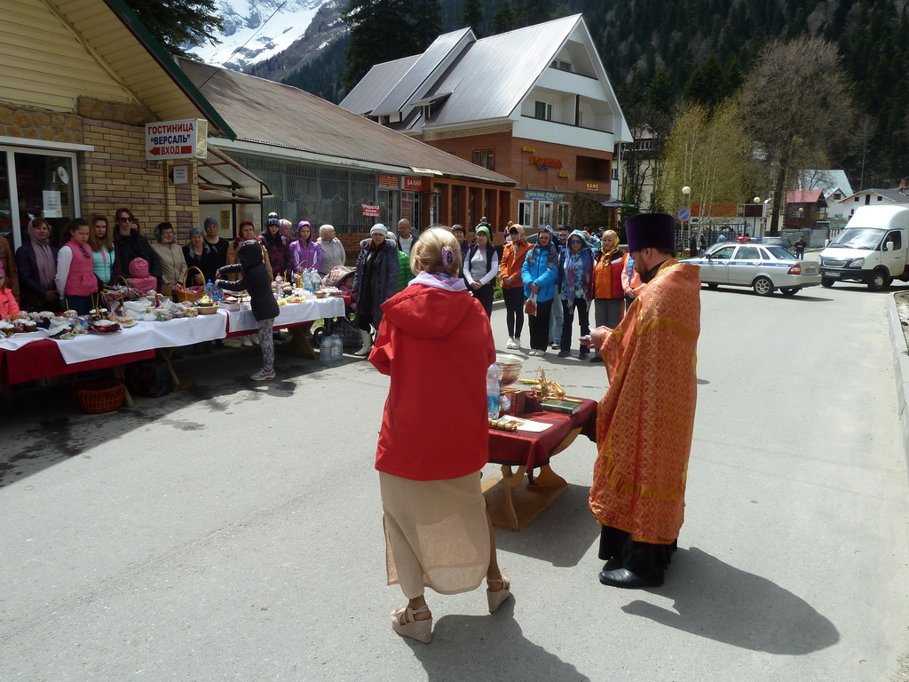 В день Светлого Христова Воскресения православные верующие общины в память священномученика Вениамина митрополита Петроградского поселка Домбай собрались, чтобы молитвенно восславить Воскресшего Христа. По окончании пасхального молебна, который совершил настоятель общины иерей Сергий Фоменко, были окроплены святой водой праздничные приношения жителей и гостей поселка Домбай.