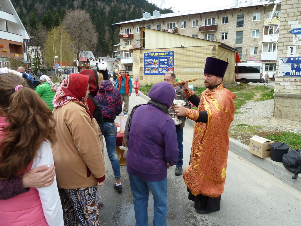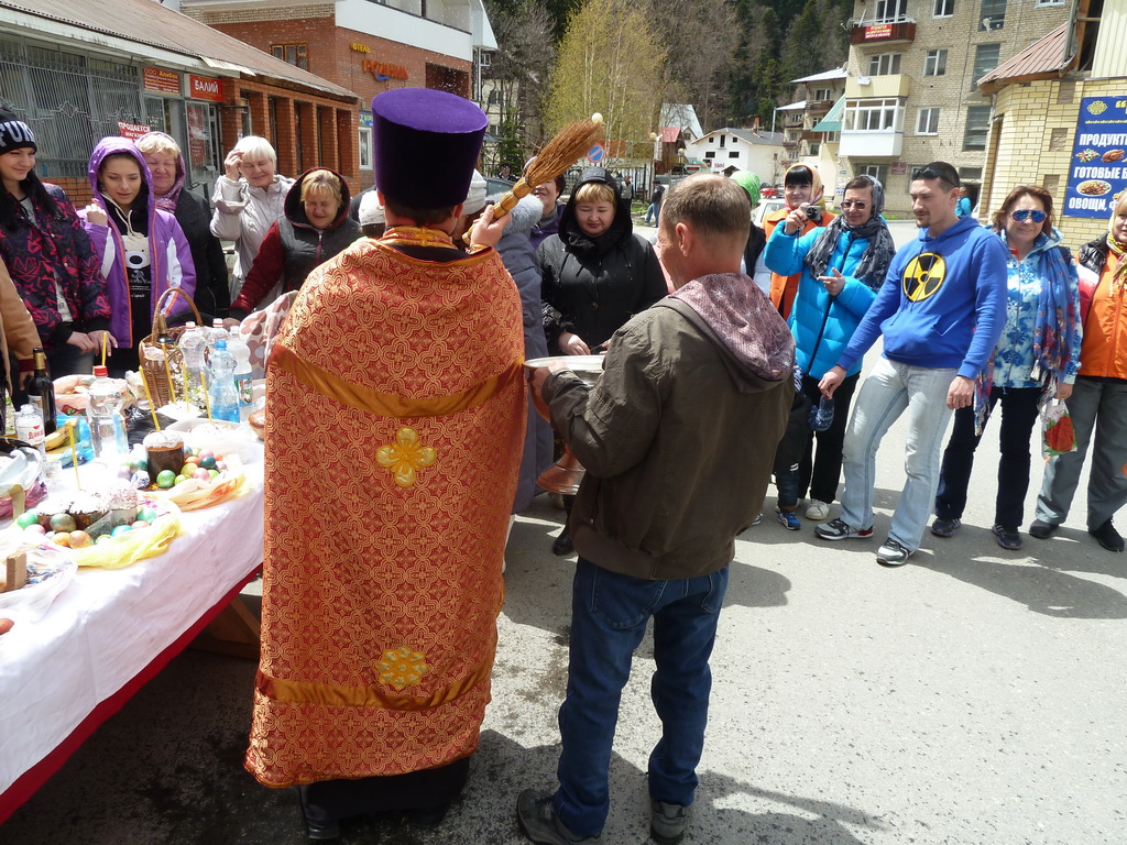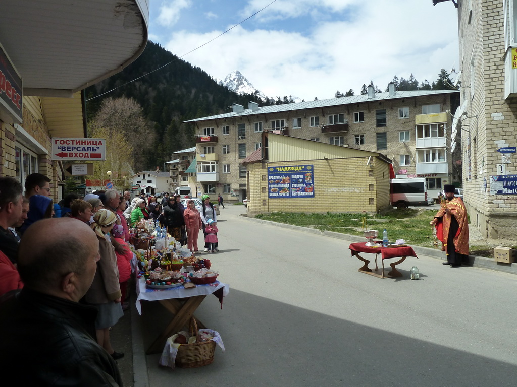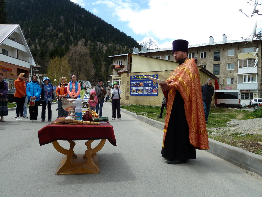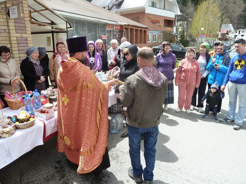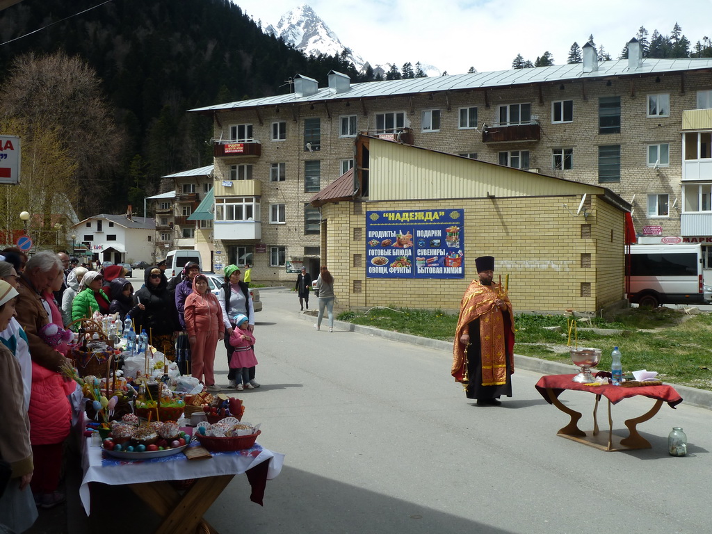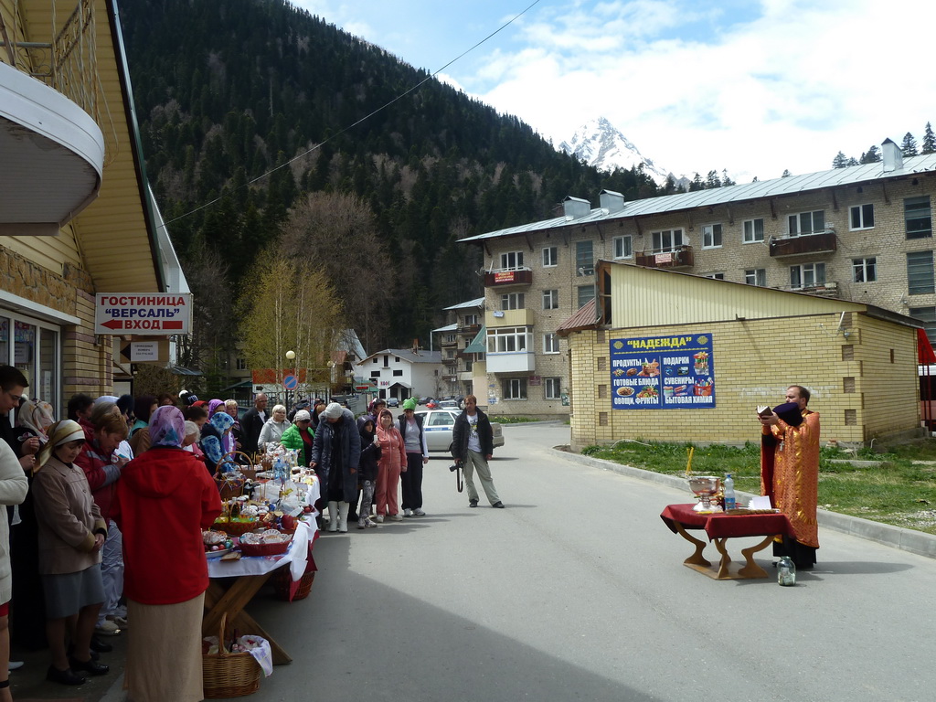 В день Светлого Христова Воскресения православные верующие общины в память священномученика Вениамина митрополита Петроградского поселка Домбай собрались, чтобы молитвенно восславить Воскресшего Христа. По окончании пасхального молебна, который совершил настоятель общины иерей Сергий Фоменко, были окроплены святой водой праздничные приношения жителей и гостей поселка Домбай.