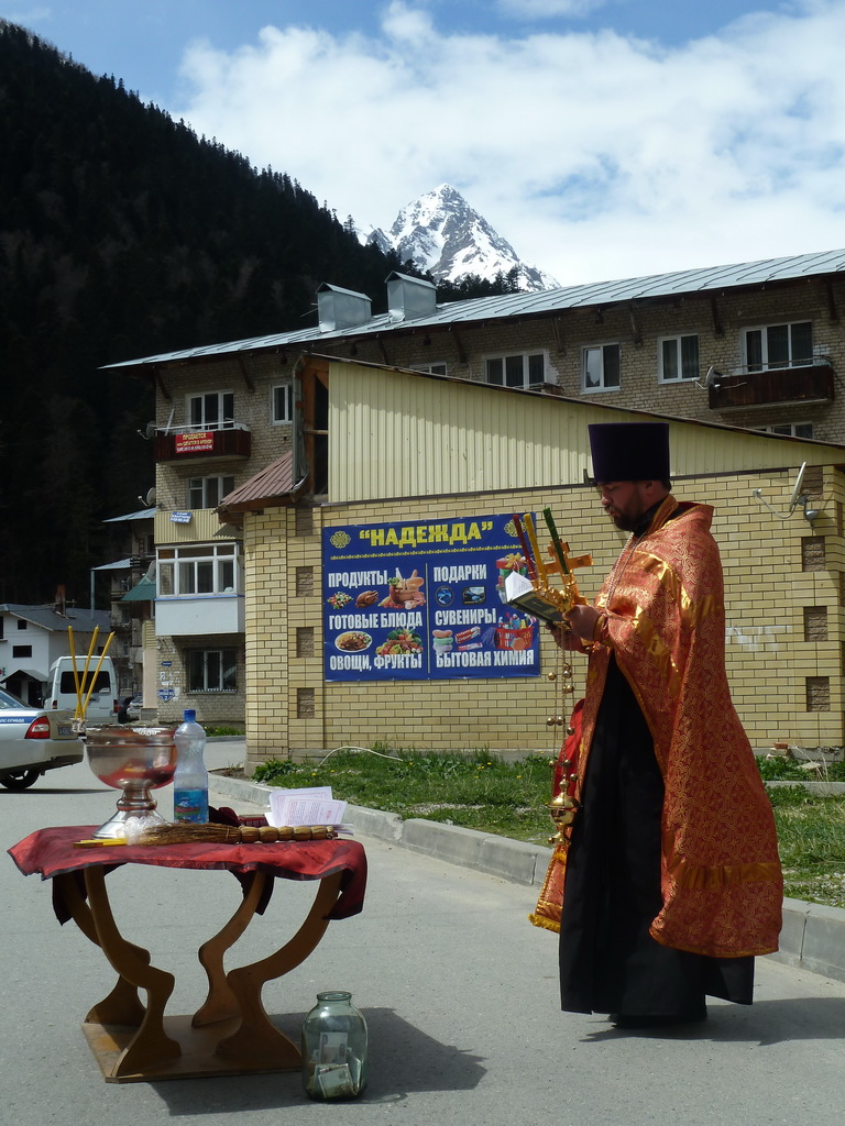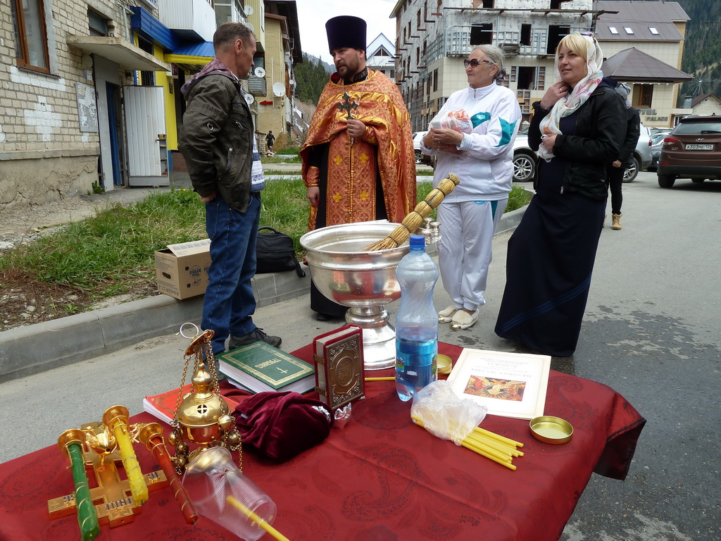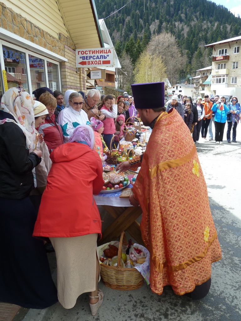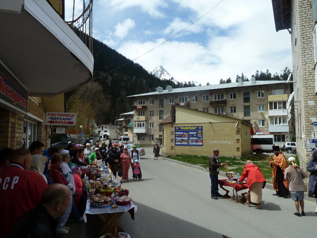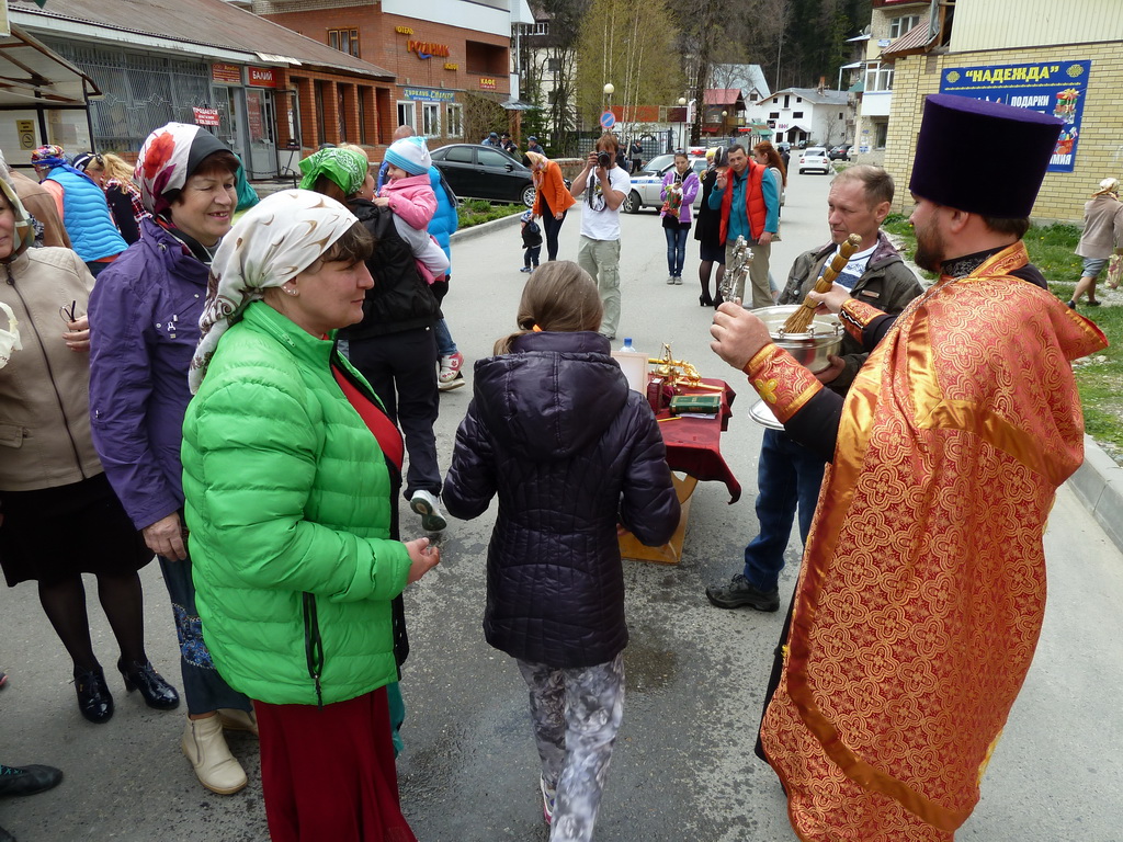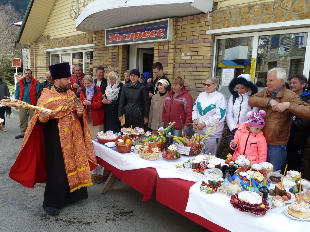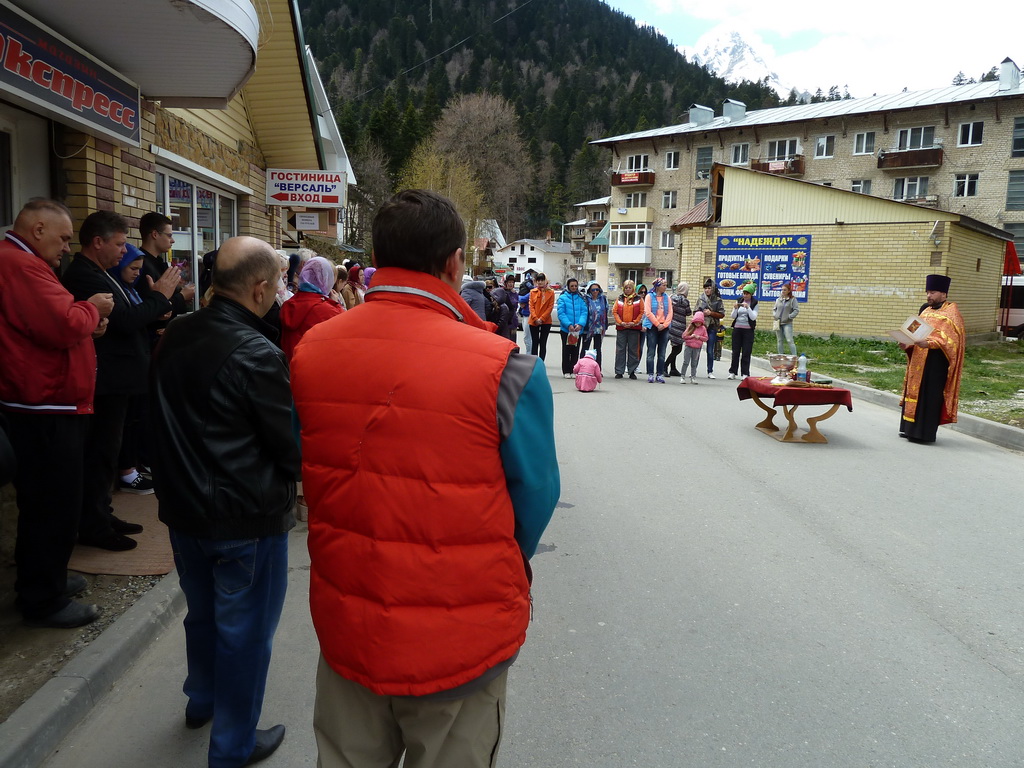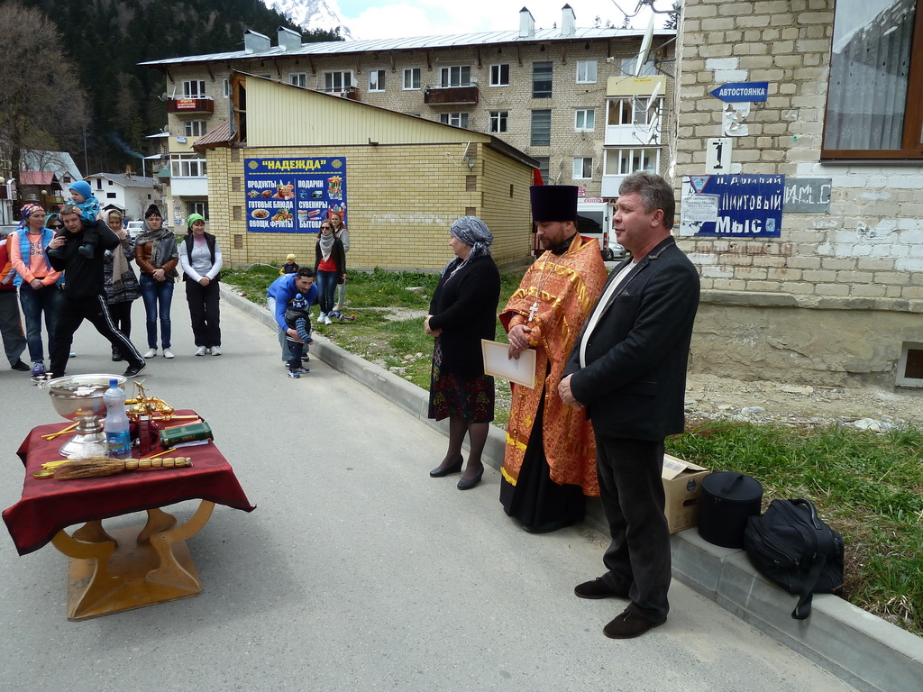 В день Светлого Христова Воскресения православные верующие общины в память священномученика Вениамина митрополита Петроградского поселка Домбай собрались, чтобы молитвенно восславить Воскресшего Христа. По окончании пасхального молебна, который совершил настоятель общины иерей Сергий Фоменко, были окроплены святой водой праздничные приношения жителей и гостей поселка Домбай.