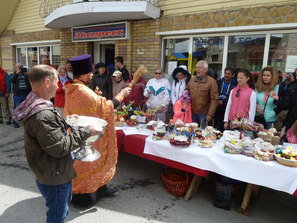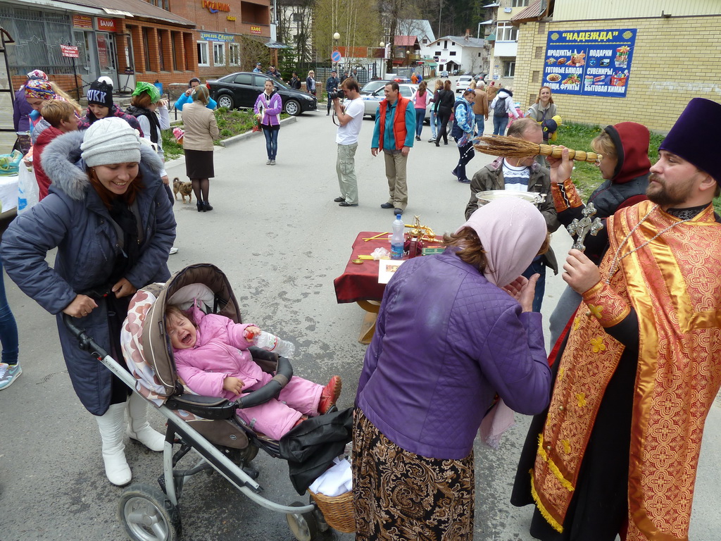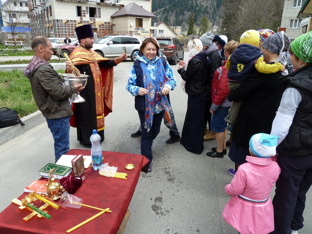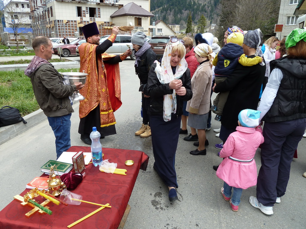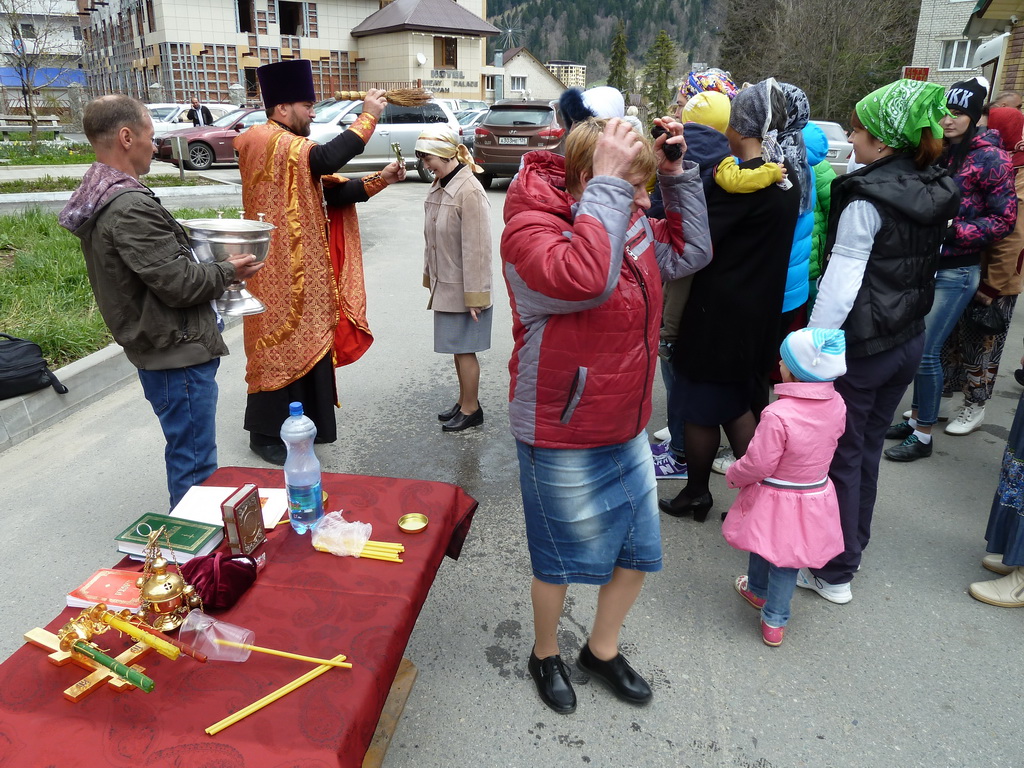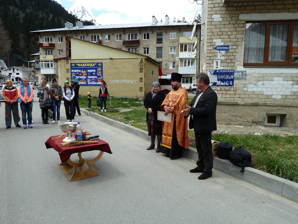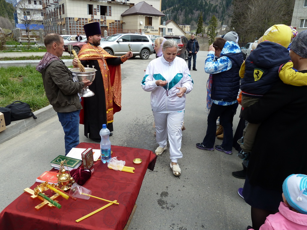 В день Светлого Христова Воскресения православные верующие общины в память священномученика Вениамина митрополита Петроградского поселка Домбай собрались, чтобы молитвенно восславить Воскресшего Христа. По окончании пасхального молебна, который совершил настоятель общины иерей Сергий Фоменко, были окроплены святой водой праздничные приношения жителей и гостей поселка Домбай.