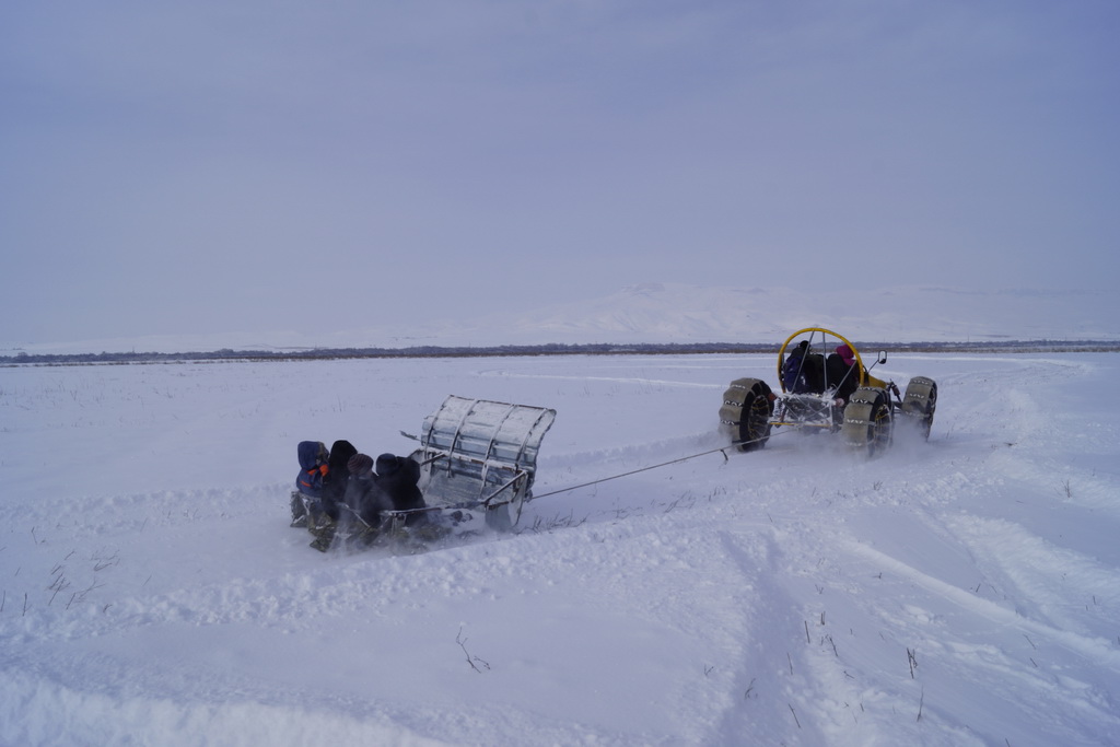 Сама машина не может взять много пассажиров, поэтому к ней прицепляются специальные сани. А кто сел в эти сани хоть раз, обязательно захочет прокатиться снова.