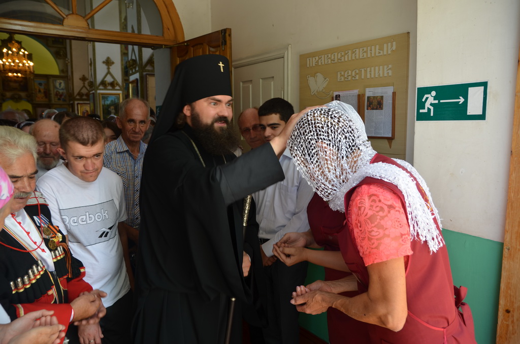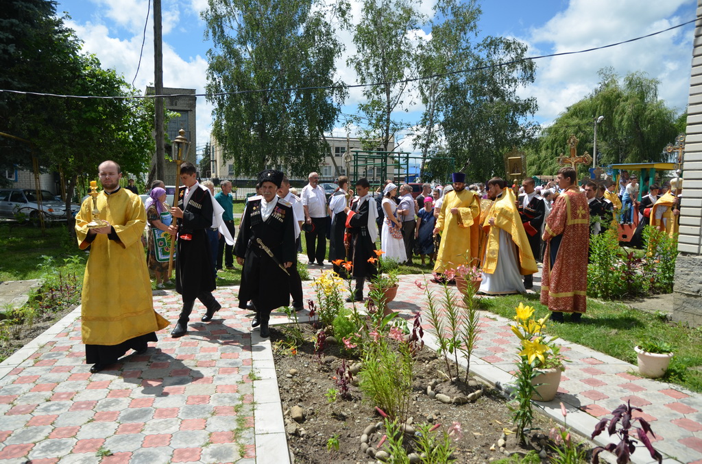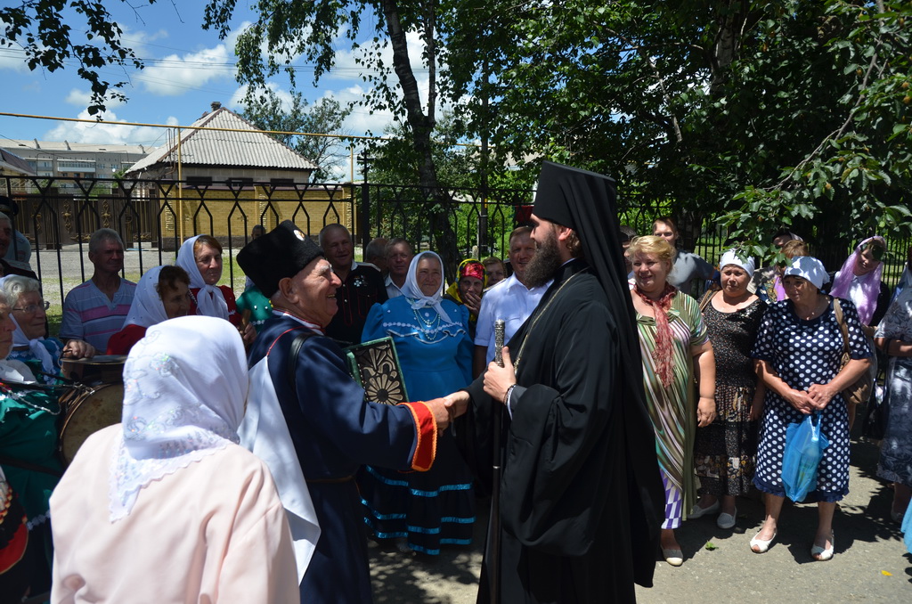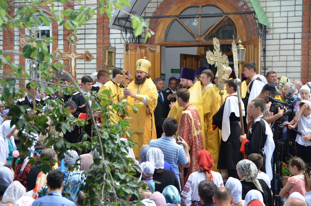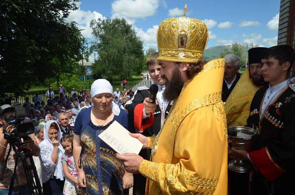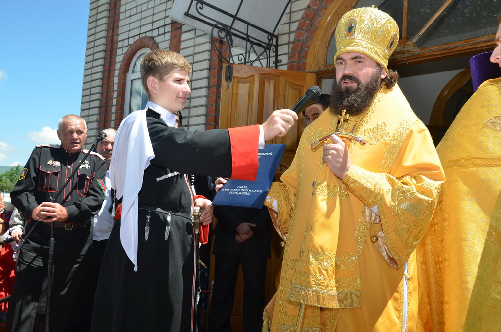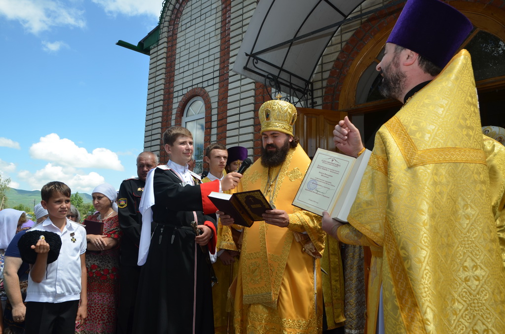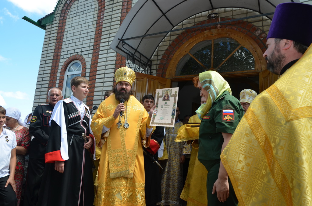 По завершении Божественной литургии состоялся уставной крестный ход во круг храма. Затем, архиепископ Феофилакт ещё раз поздравил молящихся с престольным праздником. Благословенную Патриаршую грамоту Владыка вручил Алесе Астафуровой — офицеру 34 мотострелковой бригады (горной) за труды по строительству храма на территории части. Особо потрудившихся в организации престольного праздника представителей казачества и прихожан Архипастырь удостоил Архиерейских грамот, благодарственных писем, и именных Библий. После чего, были зачитаны приветственные адреса врио Главы республики Рашида Темрезова, и Председателя Парламента республики Александра Иванова. Затем собравшихся поздравил Атаман Баталпашинского отдела Кубанского казачьего Виктор Бородкин.
