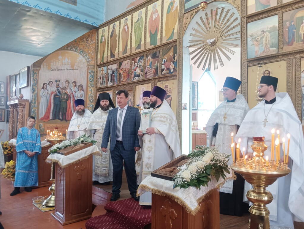 Глава администрации Зеленчукского района вручила Благодарственное письмо настоятелю храма иерею Александру Якушеву.
