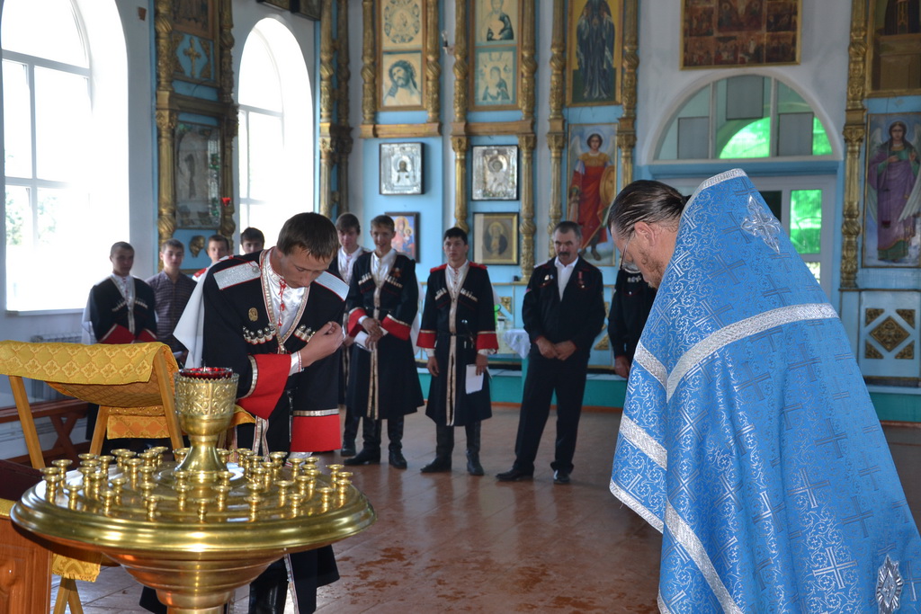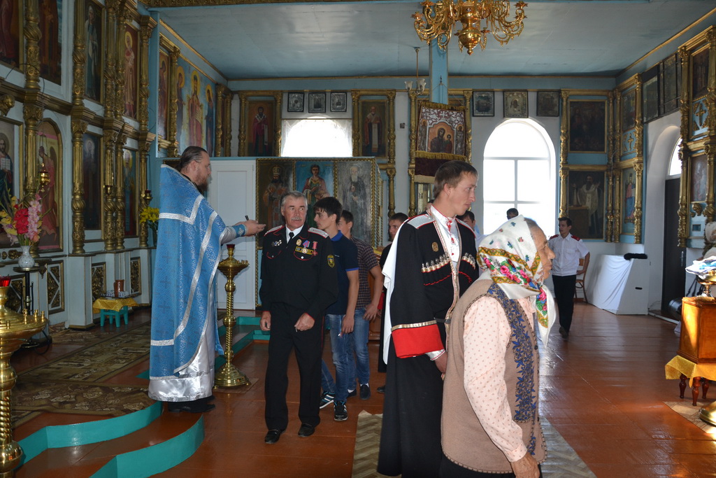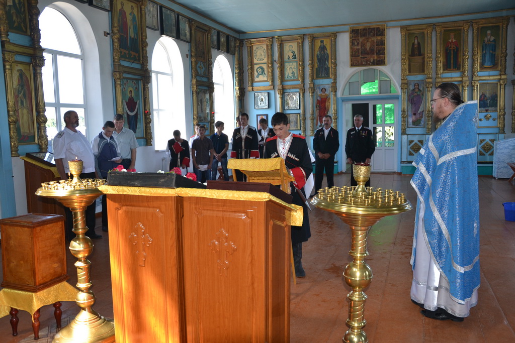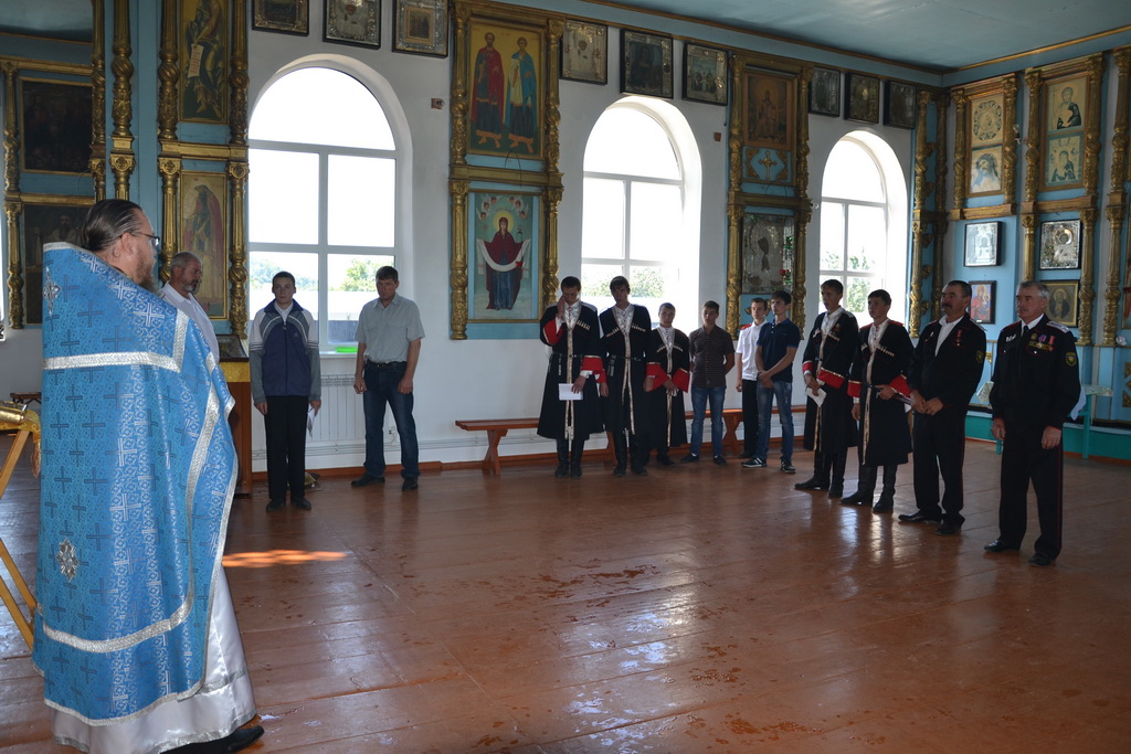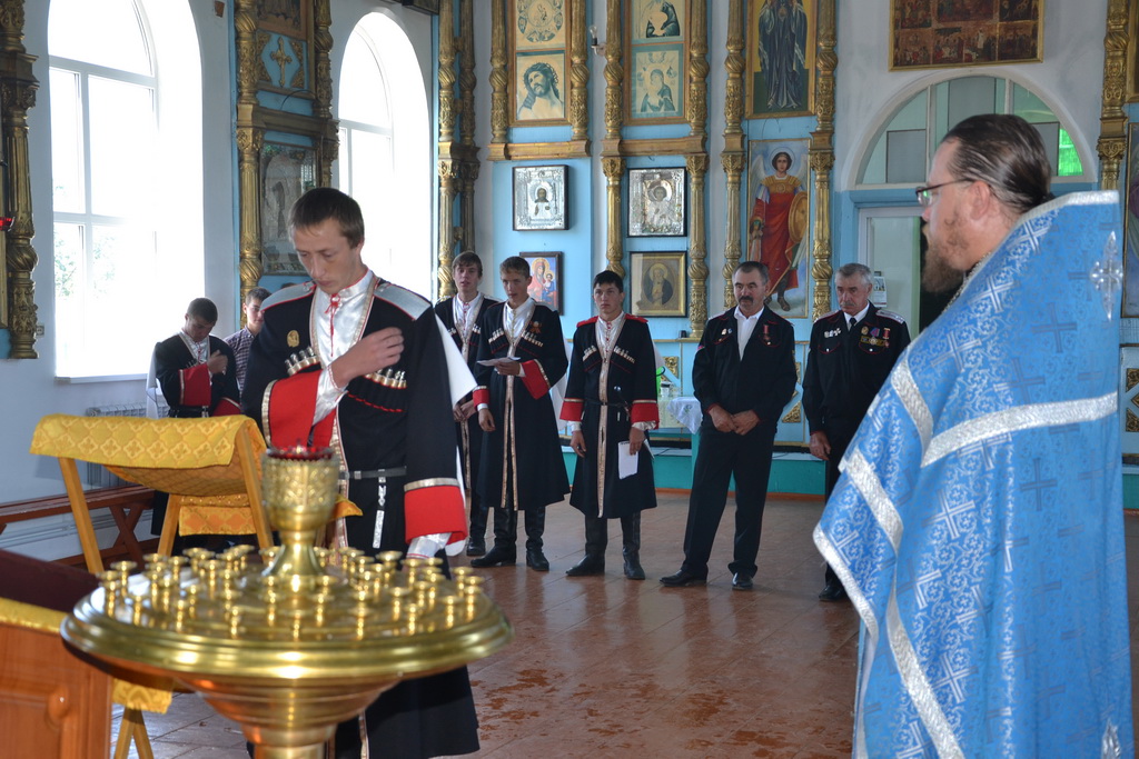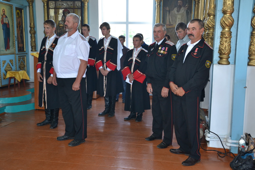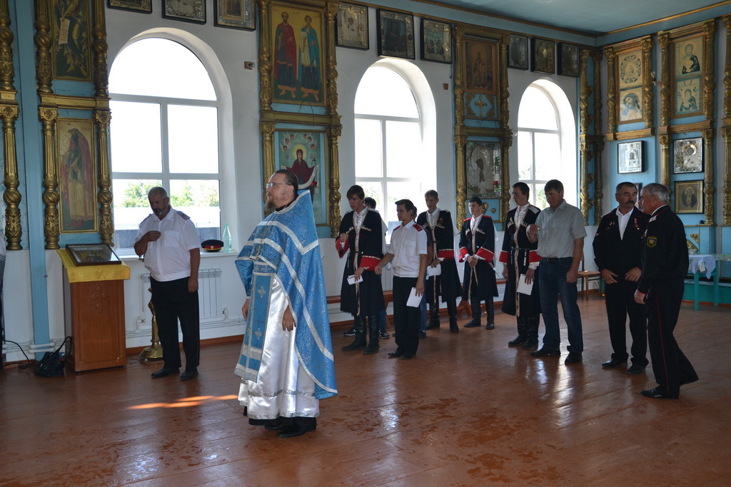 После торжественной клятвы, засвидетельствованной целованием святых Креста и Евангелия, казаков поздравили настоятель храма и станичный атаман Иван Петрович Пустовой.