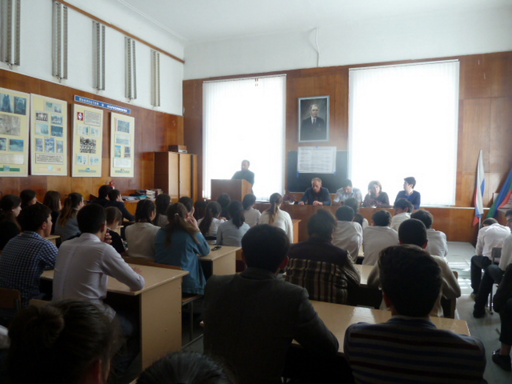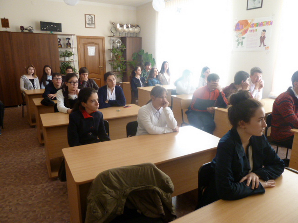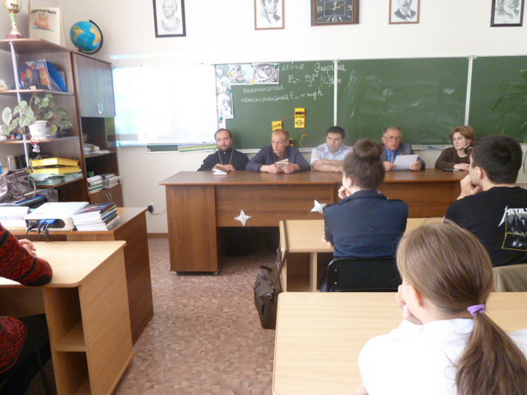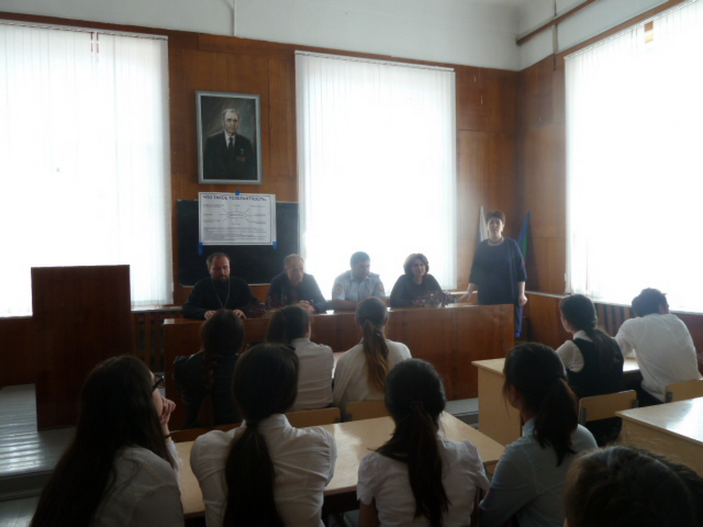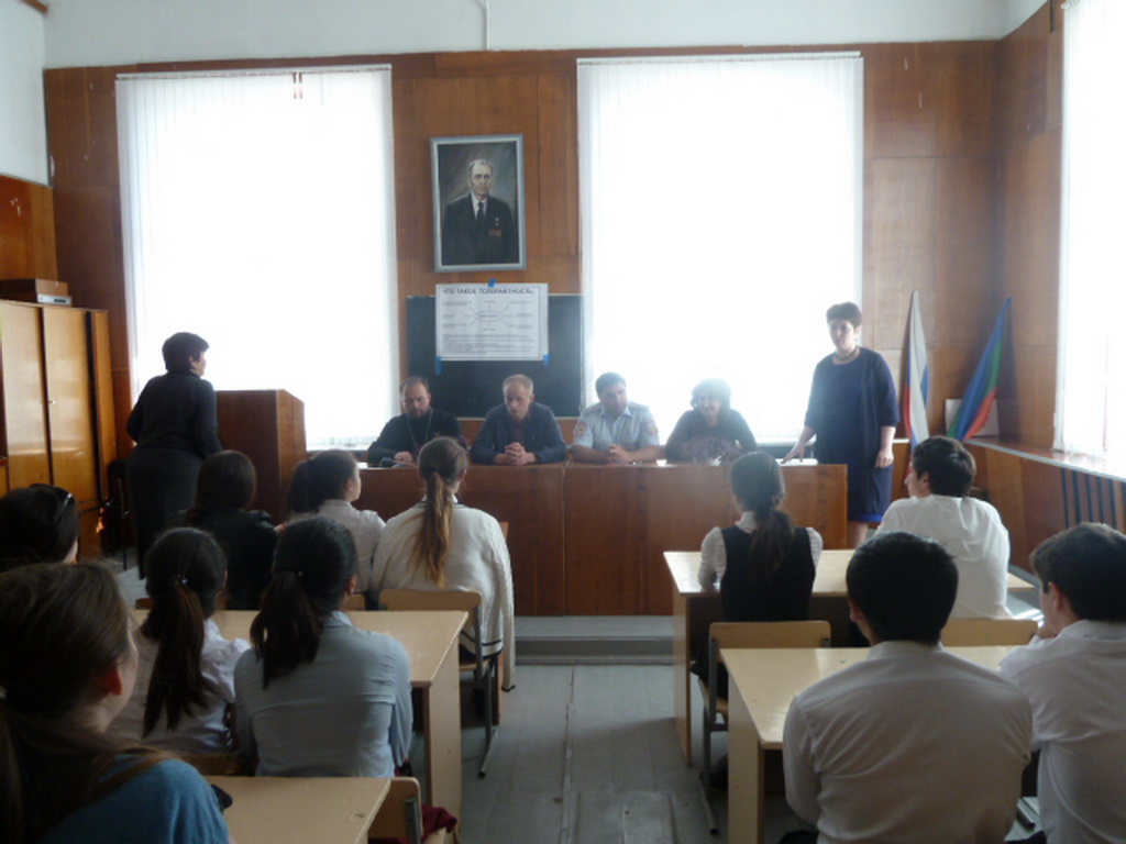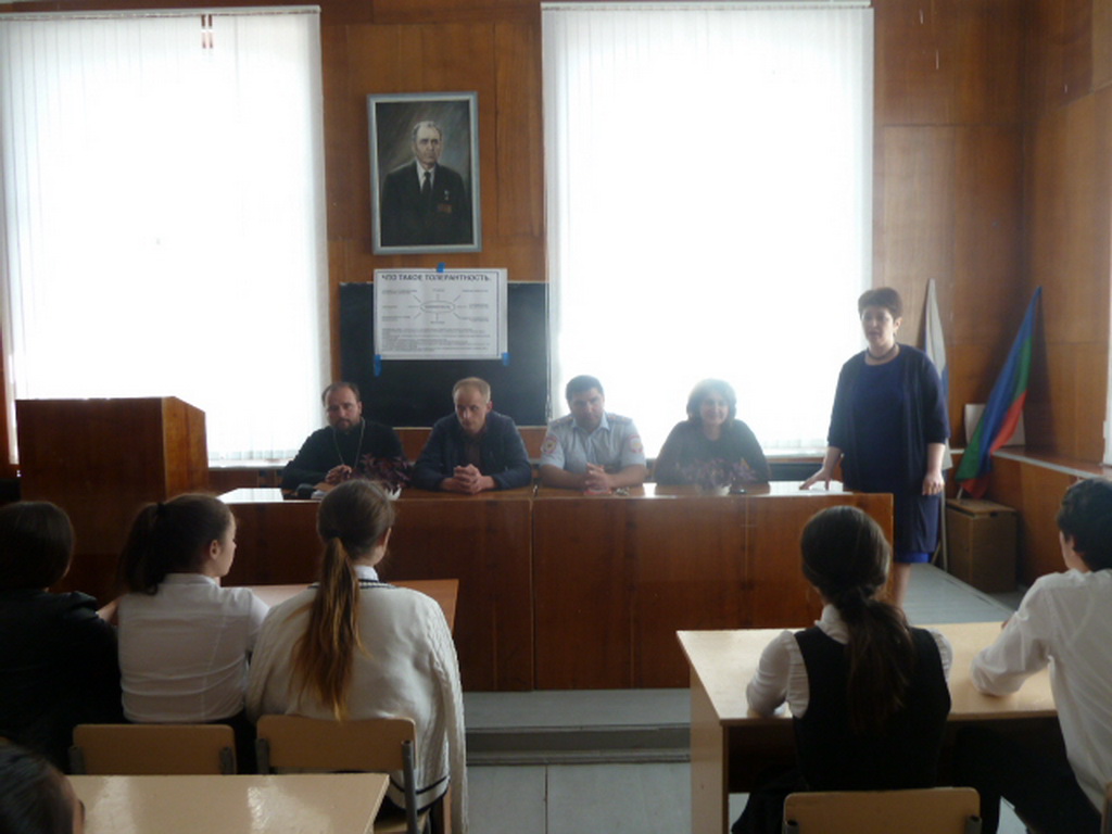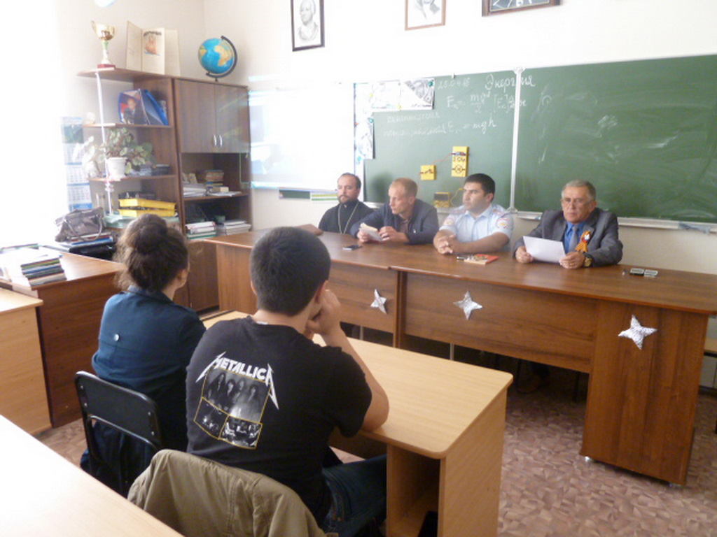Перед учащимися старших классов средней школы №6 и средней школы №1 выступили ведущий специалист Управления образования Администрации Карачаевского городского округа Хубиева Жанна, сотрудник городского отдела по делам несовершеннолетних Шумгаров Ислам, настоятель Пантелеимоновского храма города Карачаевска иерей Сергий Фоменко.