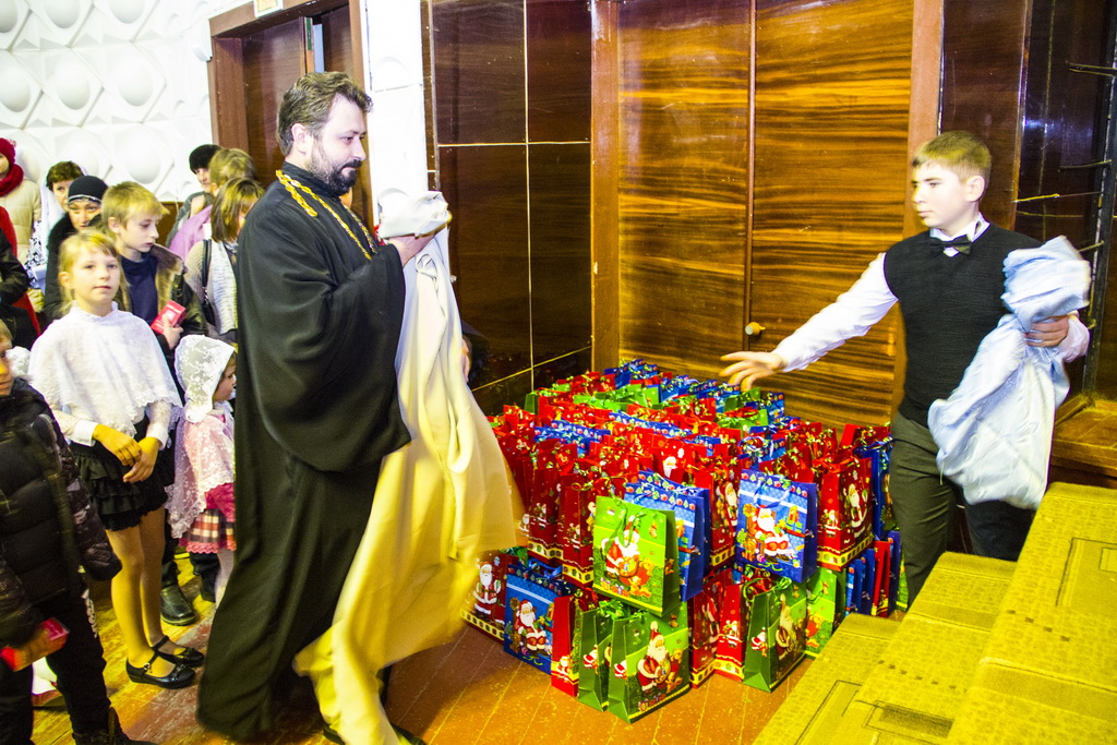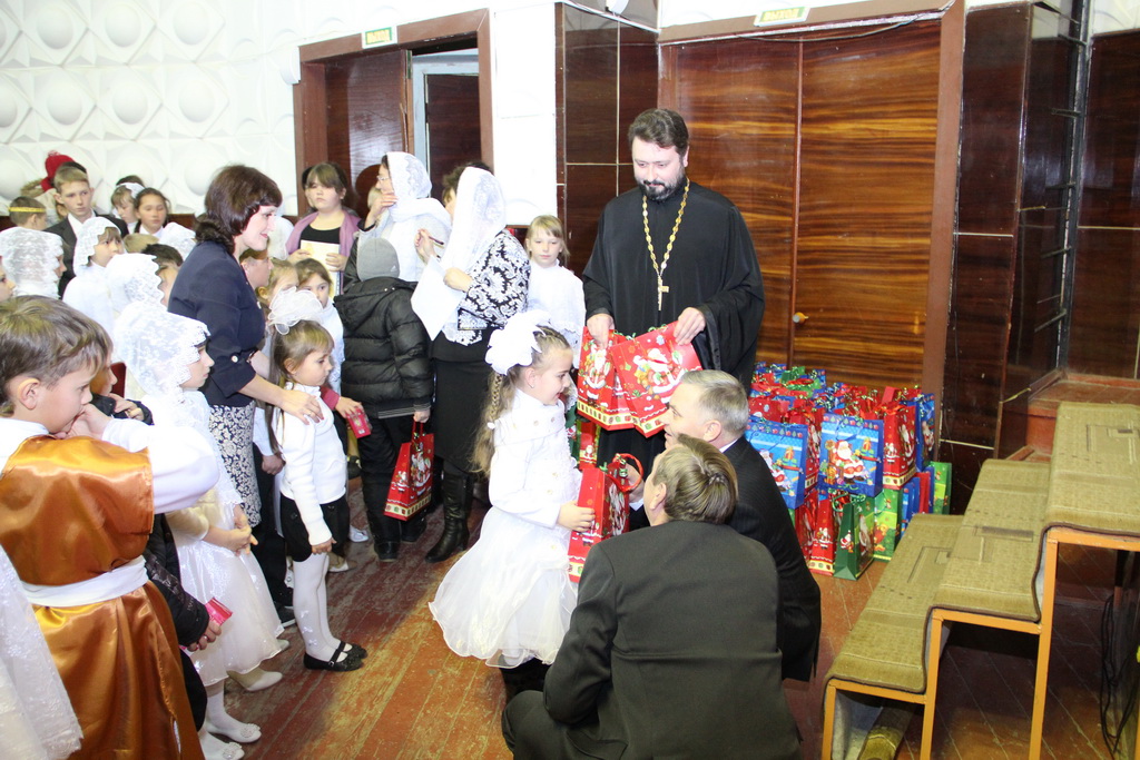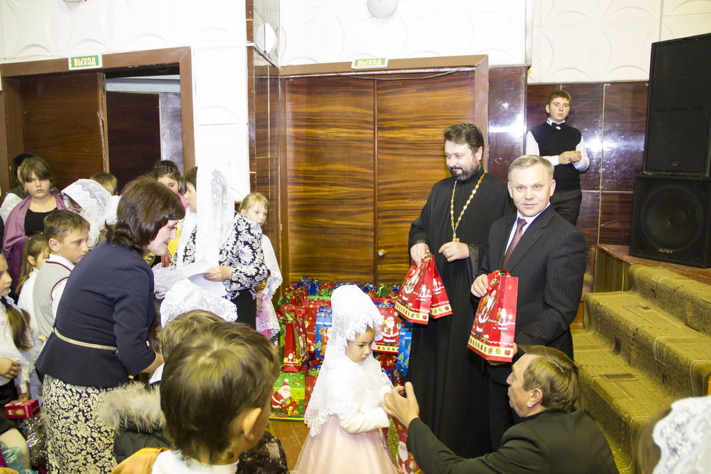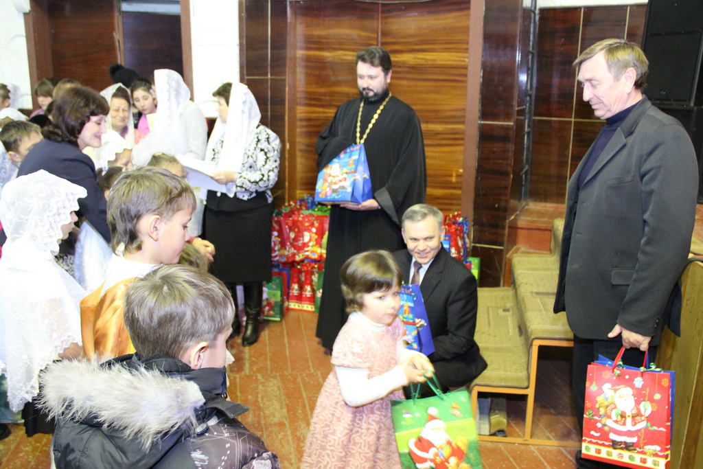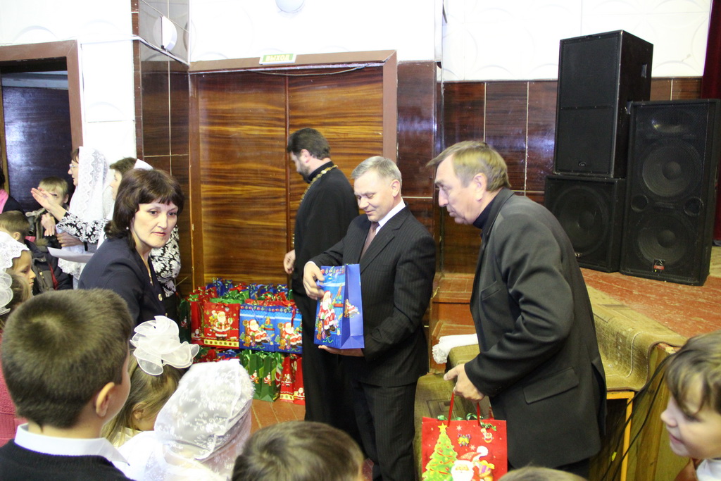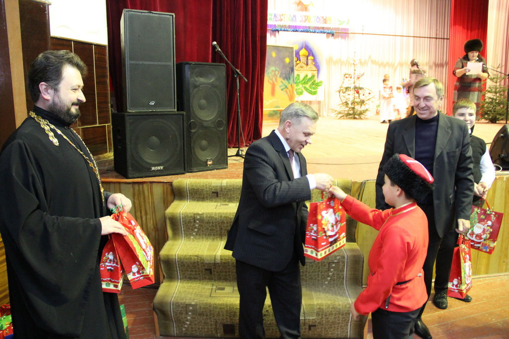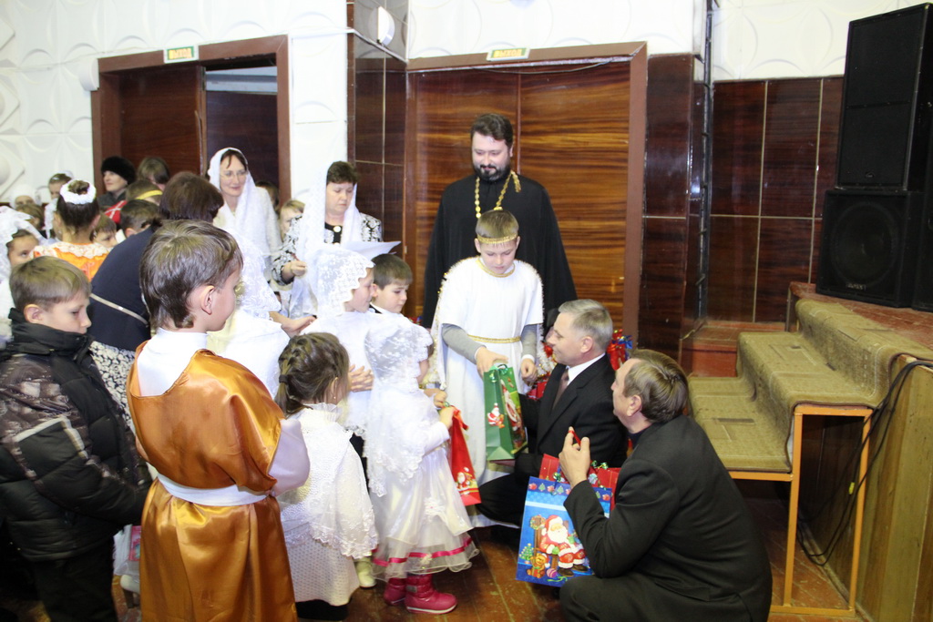 Сладкие подарки для учащихся воскресной школы были предоставлены Районной администрацией Зеленчукского муниципального района. Вручали подарки детям глава администрации района Сергей Иванович Самоходкин вместе с заместителями — Петром Вильховым и Фотинией Кагиевой.