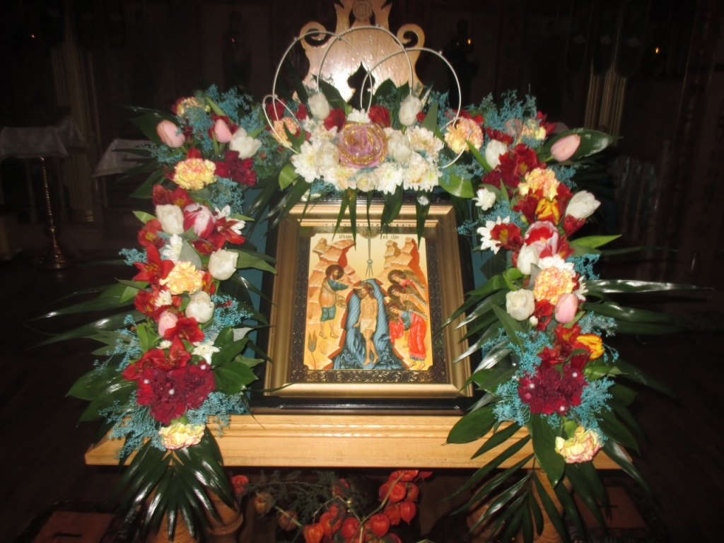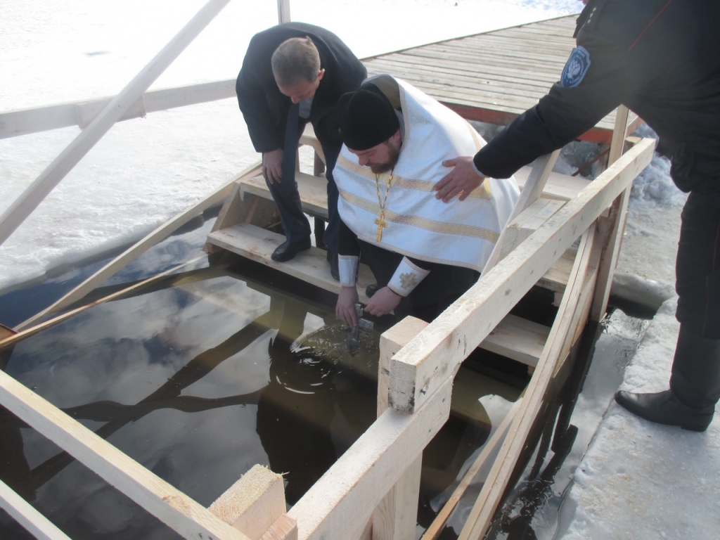 В праздник Крещения Господня совершается два водоосвящения. Одно совершается в навечерие праздника в воспоминание Крещения Господня, а другое — в сам праздник. Обычно освящение воды совершается в центре храма, но в некоторых приходах, преимущественно сельских, сохранился обычай ходить на ближайший водоем, где заранее подготовлена прорубь — «иордань». Обычай освящения воды в день Крещения известен был уже в III веке. Водоосвящение в навечерие праздника Крещения совершается следующим образом: из алтаря выходят священнослужители, предстоятель держит на голове святой Крест в преднесении светильников. В это время певчие поют: «Глас Господень на водах вопиет, глаголя» и другие тропари. Затем читаются три паремии, Апостол и Евангелие, повествующие о крещении Исуса Христа. После Евангелия диакон произносит ектению; затем священник читает водосвятную молитву, в которой просит Господа даровать всем причащающимся и мажущимся святой водой освящение, здравие, очищение и благословение. После молитвы священник троекратно погружает Крест в воду при пении тропаря: «Во Иордане крещающутися, Господи». Затем священник освященною водой кропит храм, всех присутствующих. В сам праздник водоосвящению предшествует пение канона-молебна празднику, по 6-ой песни которого водоосвящение совершается по тому же чину.