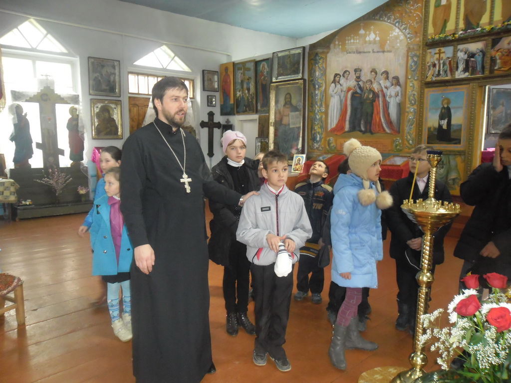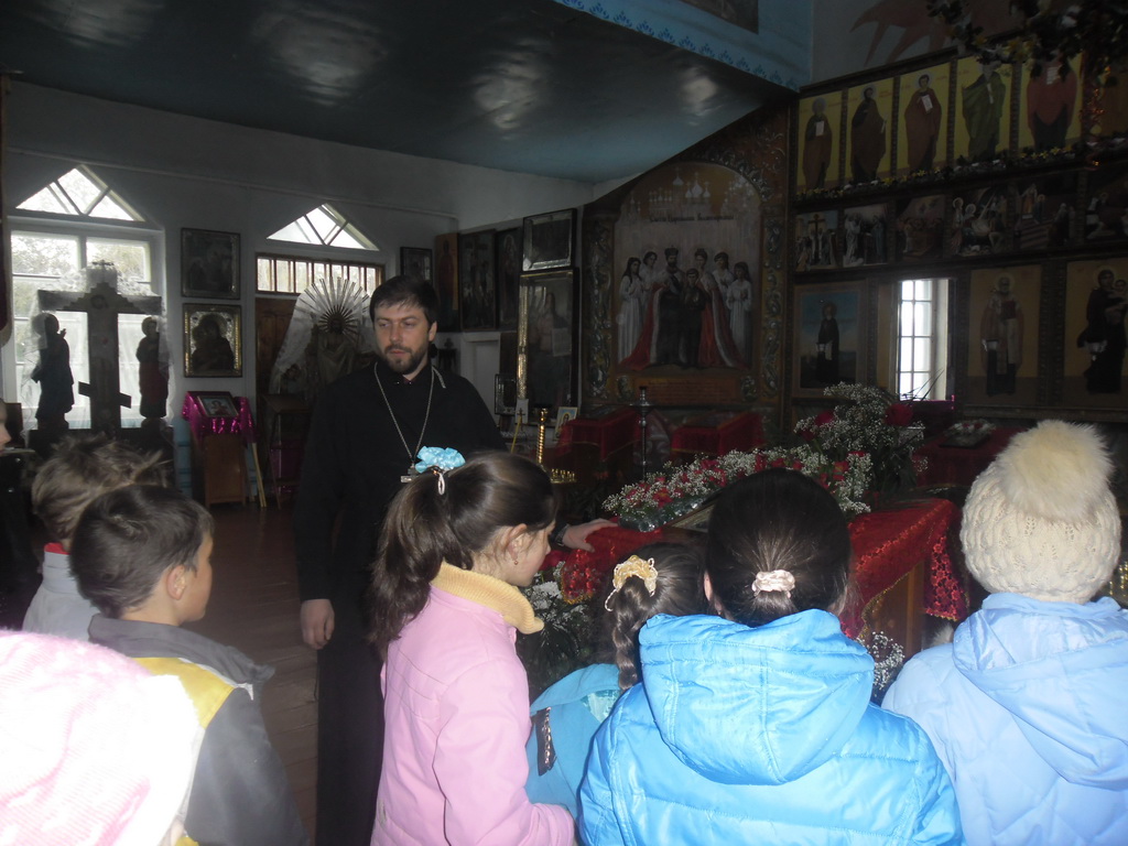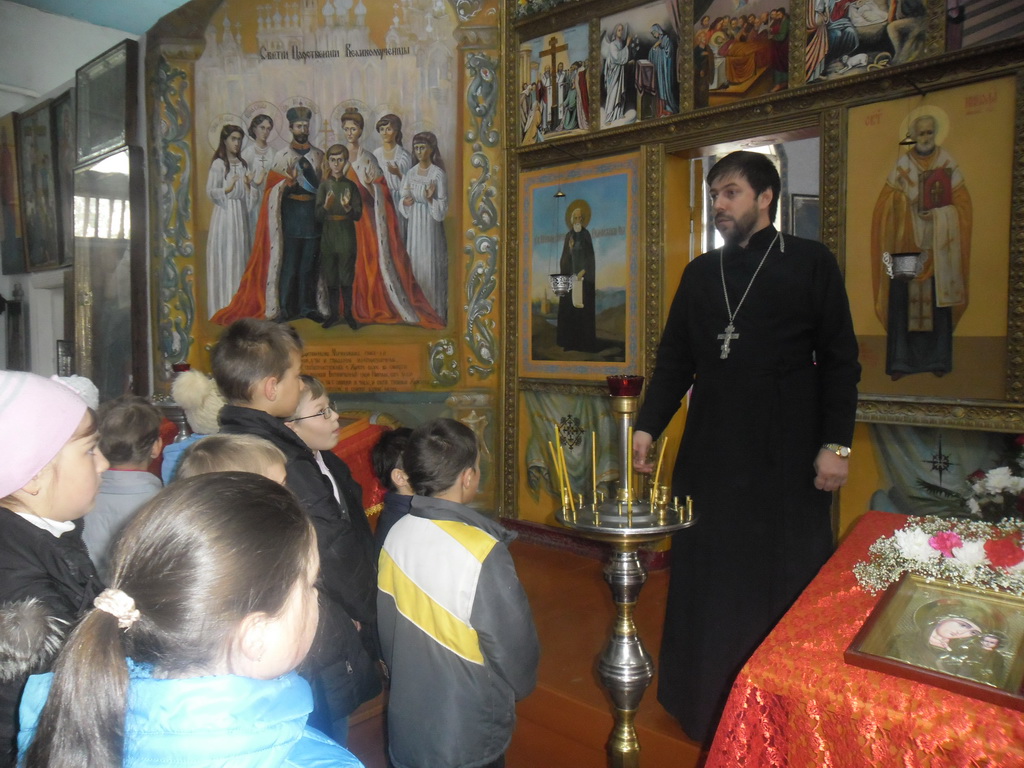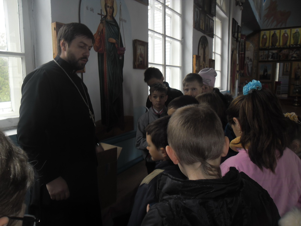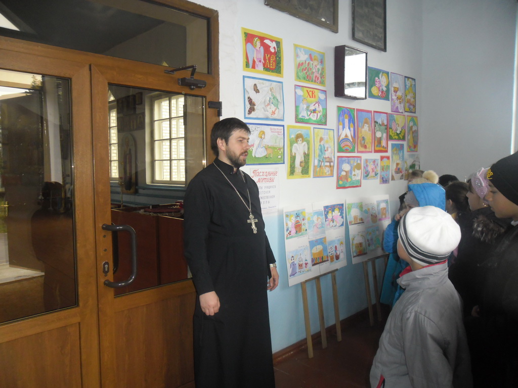 В храме детей встретил настоятель иерей Александр Якушев. Он провел экскурсию по храму, рассказал об основных понятиях православной веры, о святынях храма, и о самом главном празднике для верующих — Воскресении Христовом. Ребятишки с огромным интересом слушали священника и задавали вопросы. С неподдельным интересом ученики выслушали рассказ о Господе нашем Иисусе Христе, Его распятии и воскресении. «Главный смысл прихода в храм заключается для человека в том, что именно в храме происходит общение со Христом. Полнота духовной жизни и приобщения Божественной благодати возможны лишь для тех людей, которые пытаются жить по заповедям Спасителя», — напомнил священник участникам экскурсии.