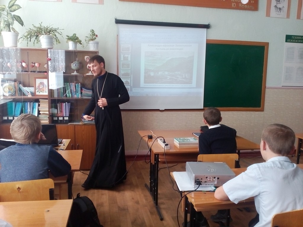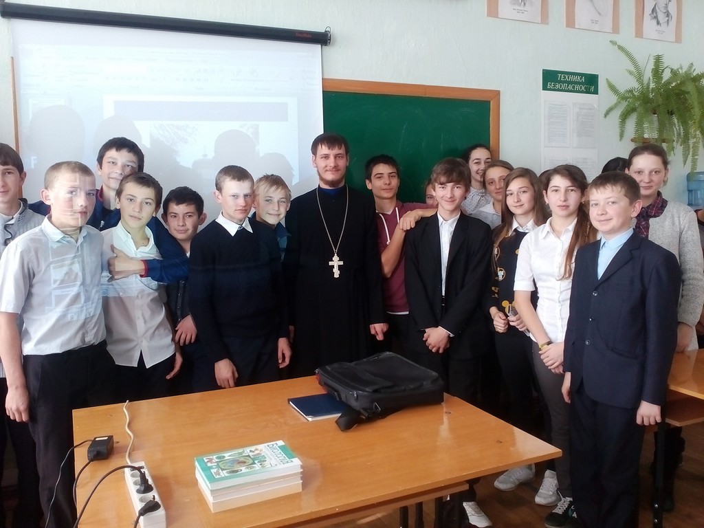 Штатный священник Петропавловского храма станицы Зеленчукской иерей Алексий Гурин провел занятие для учащихся 8-х классов средней школы №2 станицы Зеленчукской.