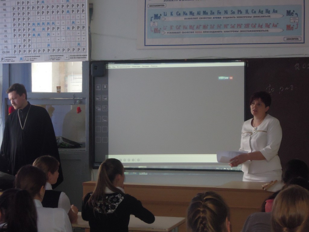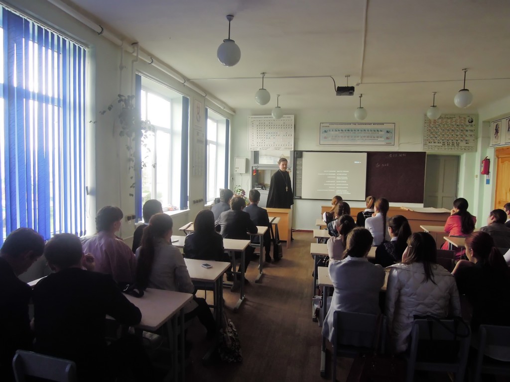 13 мая помощник благочинного Южного Карачаево-Черкесского церковного округа по образованию иерей Иоанн Афонин провел в средней школе №1 станицы Зеленчукской урок, посвященный памяти создателей славянской письменности равноапостольных Мефодия и Кирилла.