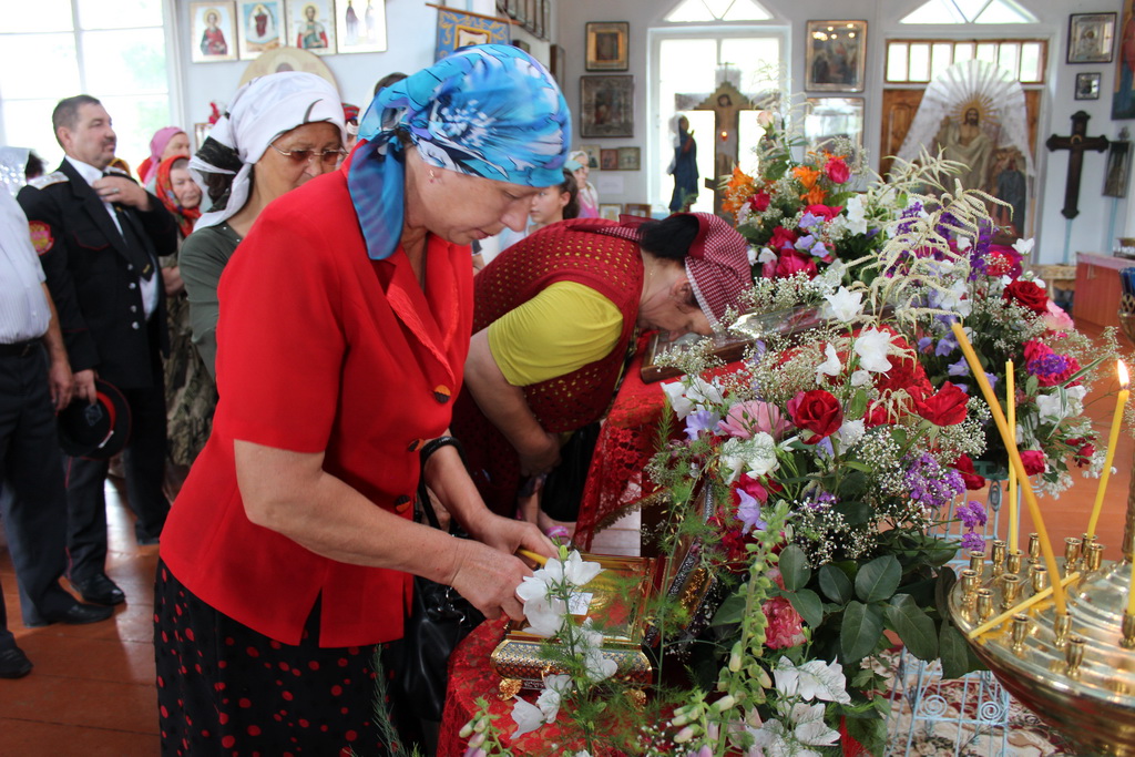 Святыню встречали казаки станицы во главе с атаманом. Под пение молитвословий, прославляющих память великомученика, Крестный ход прошел через всю станицу к Михаило-Архангельскому храму.