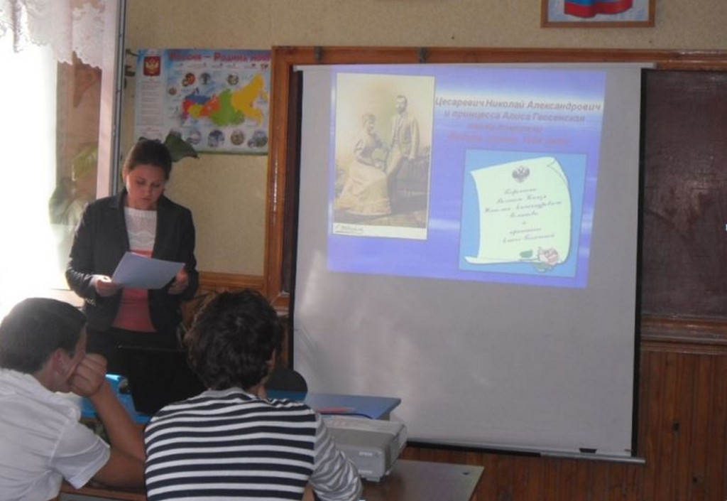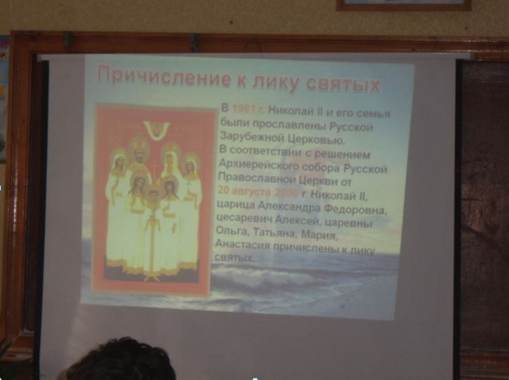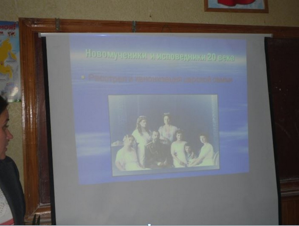 Учитель истории Лукьяненко Е.П. подобрала интересный материал для проведения урока. Она рассказала о значении слова «новомученики», а также о том,в связи с чем появился этот термин. Учащимся было рассказано о событиях, предшествовавших революции 1917 года. кратко освещена история семьи Романовых. Кроме этого учитель рассказала и о других новомученикахXX века. Весь рассказ сопровождался презентацией.