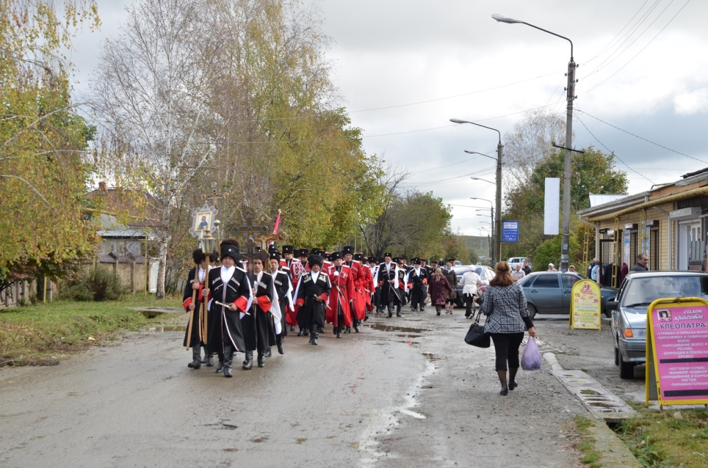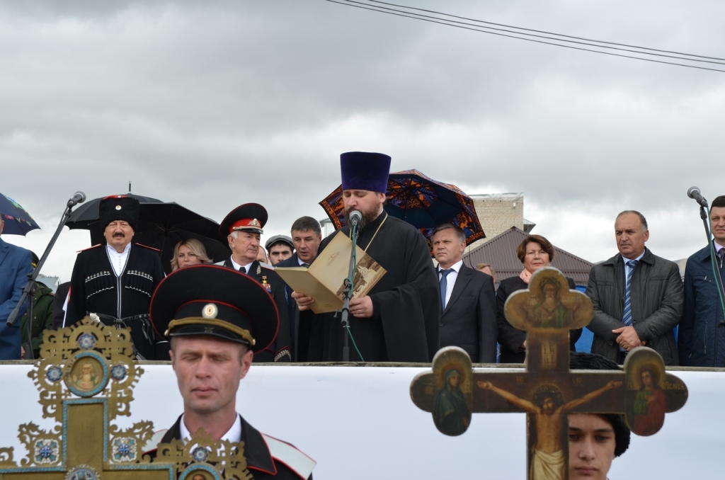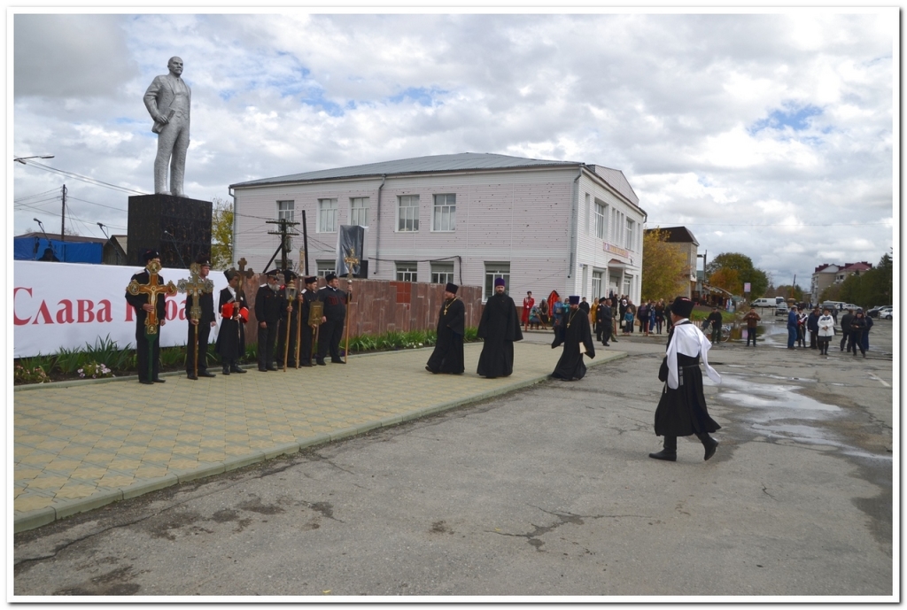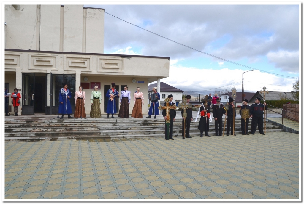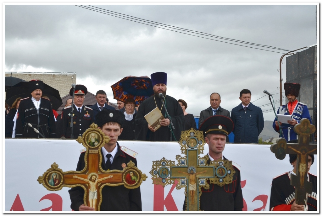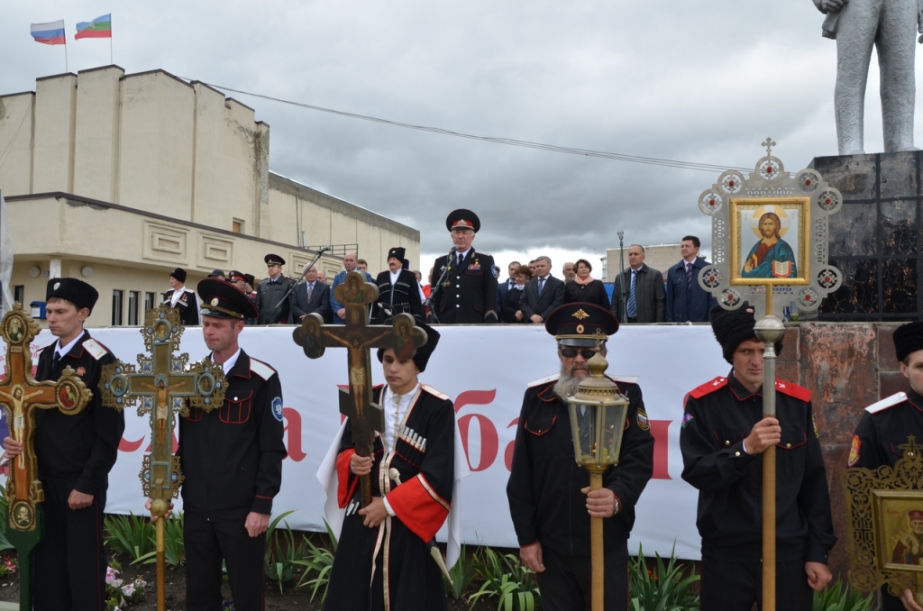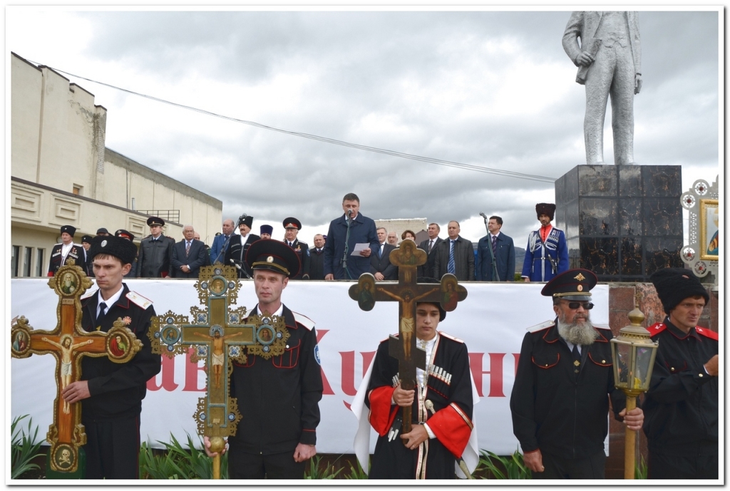 По окончании Богослужения колонна казаков прошла из храма к центральной площади станицы Зеленчукской где состоялся праздничный митинг.