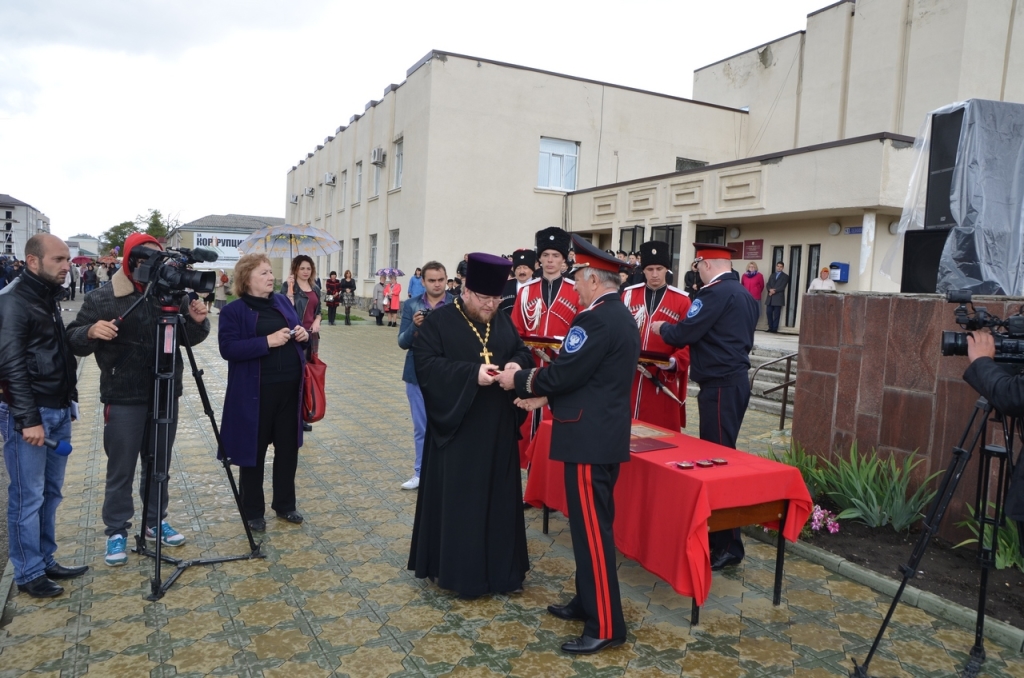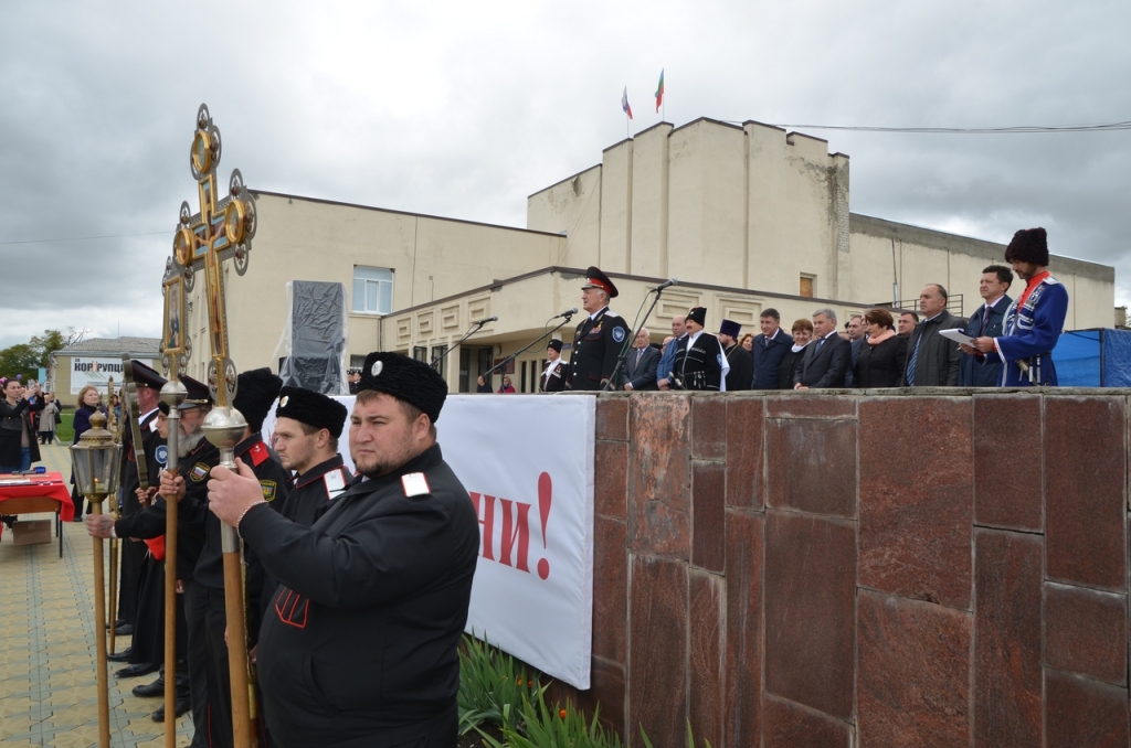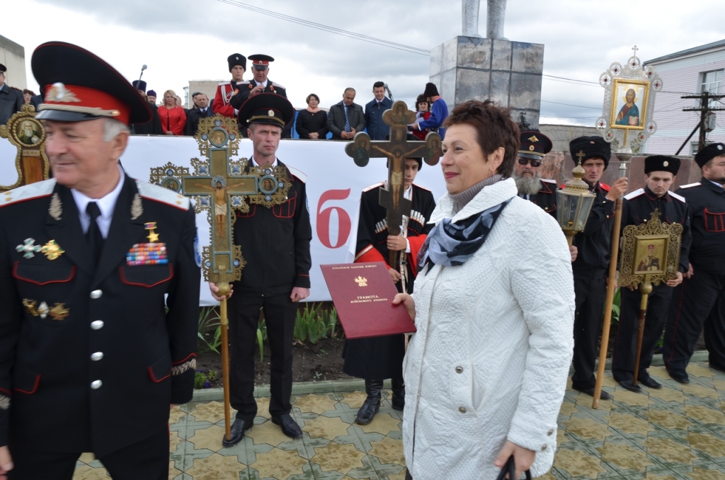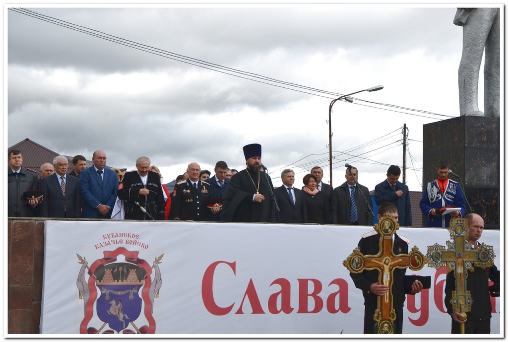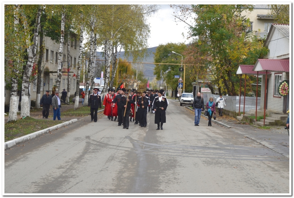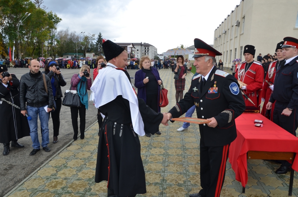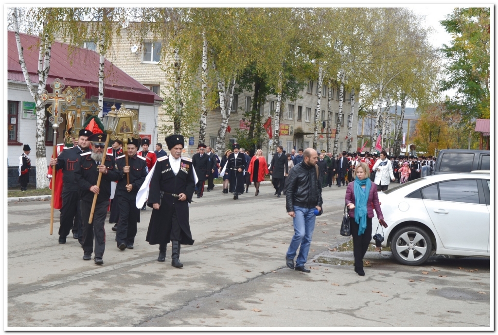 По окончании Богослужения колонна казаков прошла из храма к центральной площади станицы Зеленчукской где состоялся праздничный митинг.
