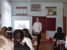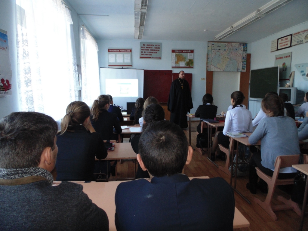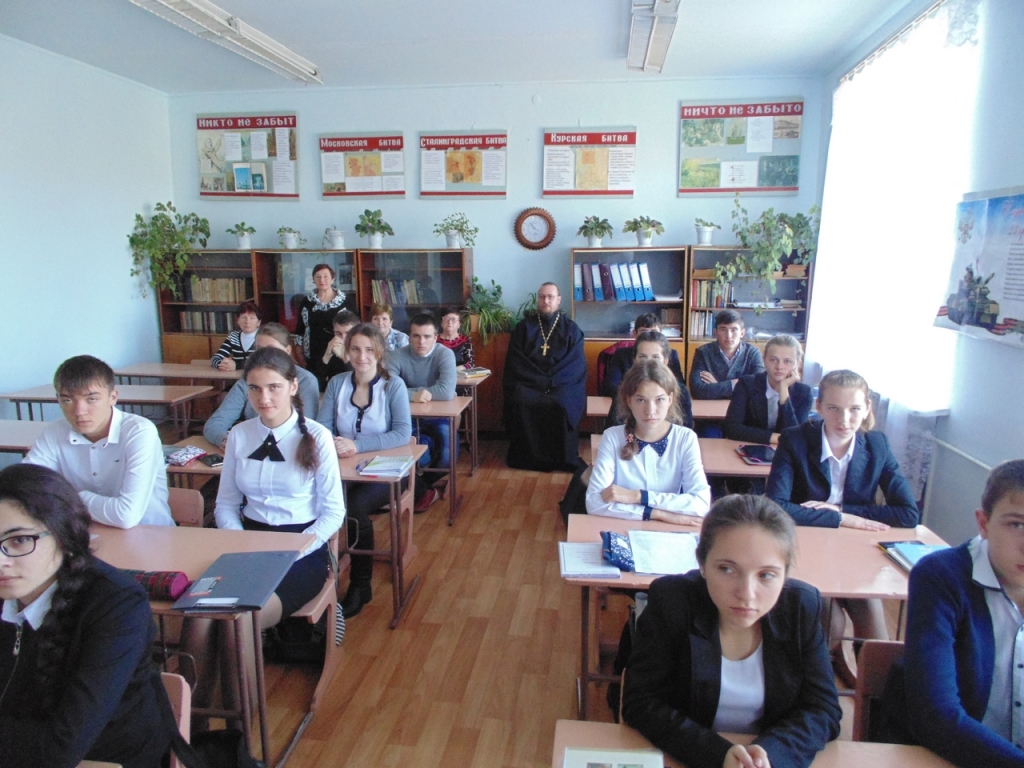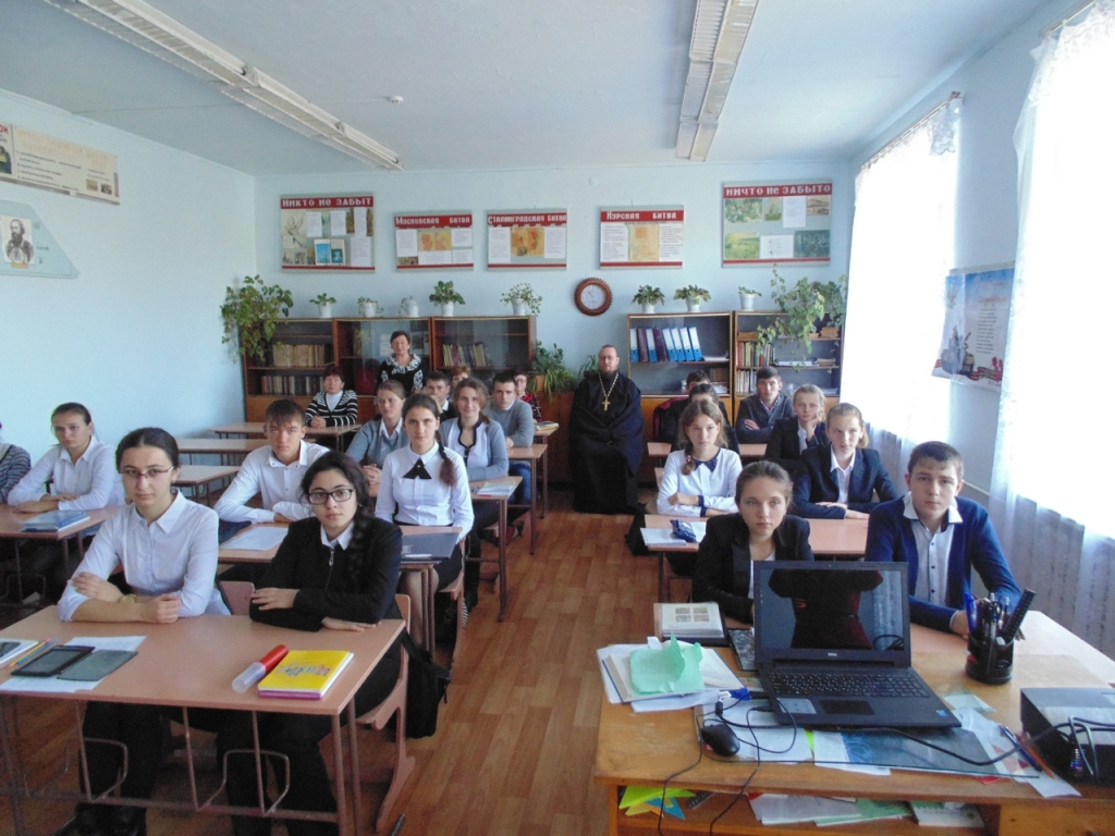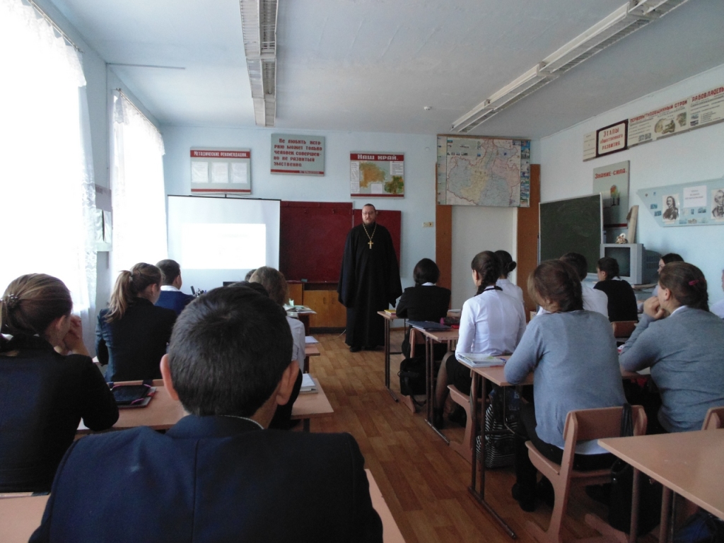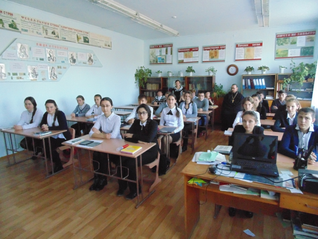 В своем выступлении протоиерей Андрей Кравченко рассказал учащимся о истории закрытия и разорения Зеленчукской второафонской Александро-Невской пустыни и Спасо-Преображенского Сентинского монастыря.