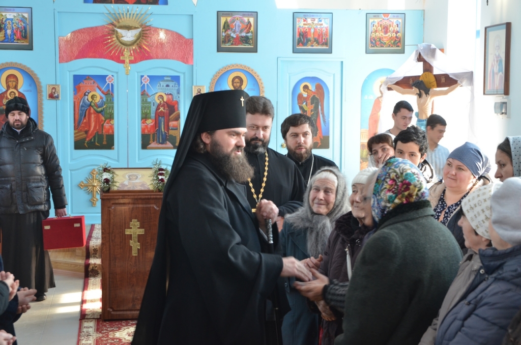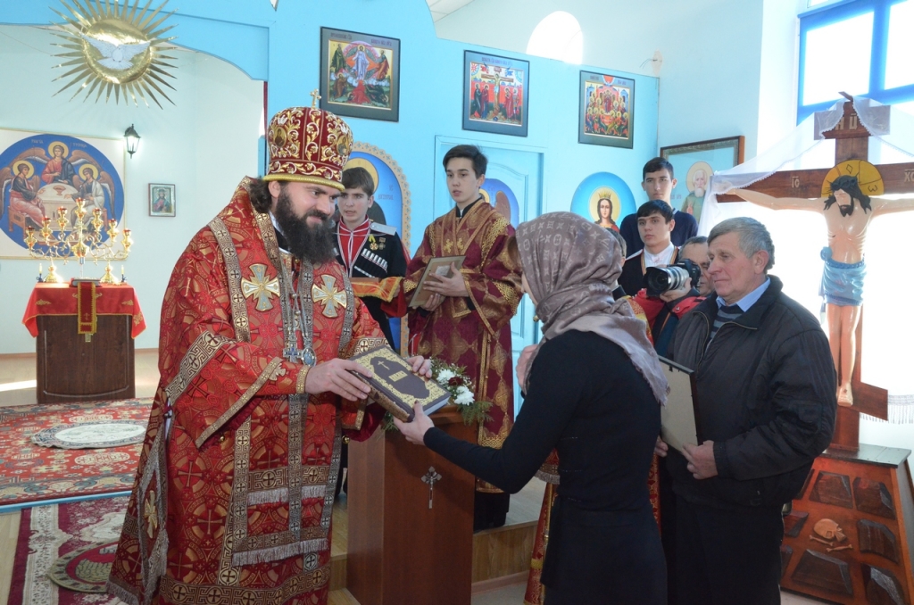 По окончании Богослужения Владыка вручил благодарственные письма и памятные подарки прихожанам, активно трудившимся для восстановления храма после пожара.
