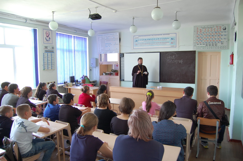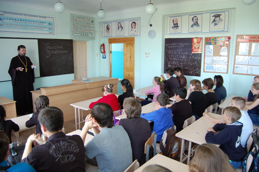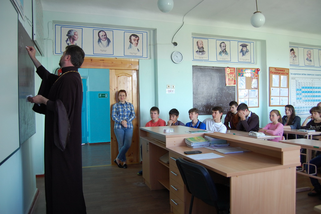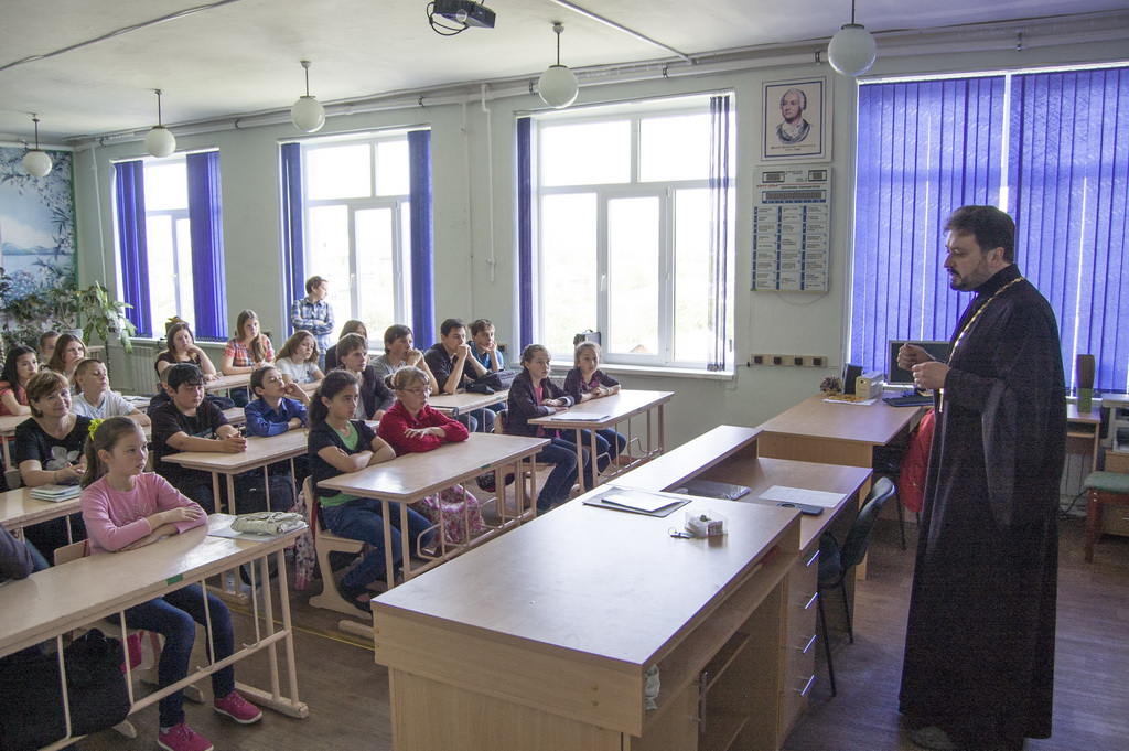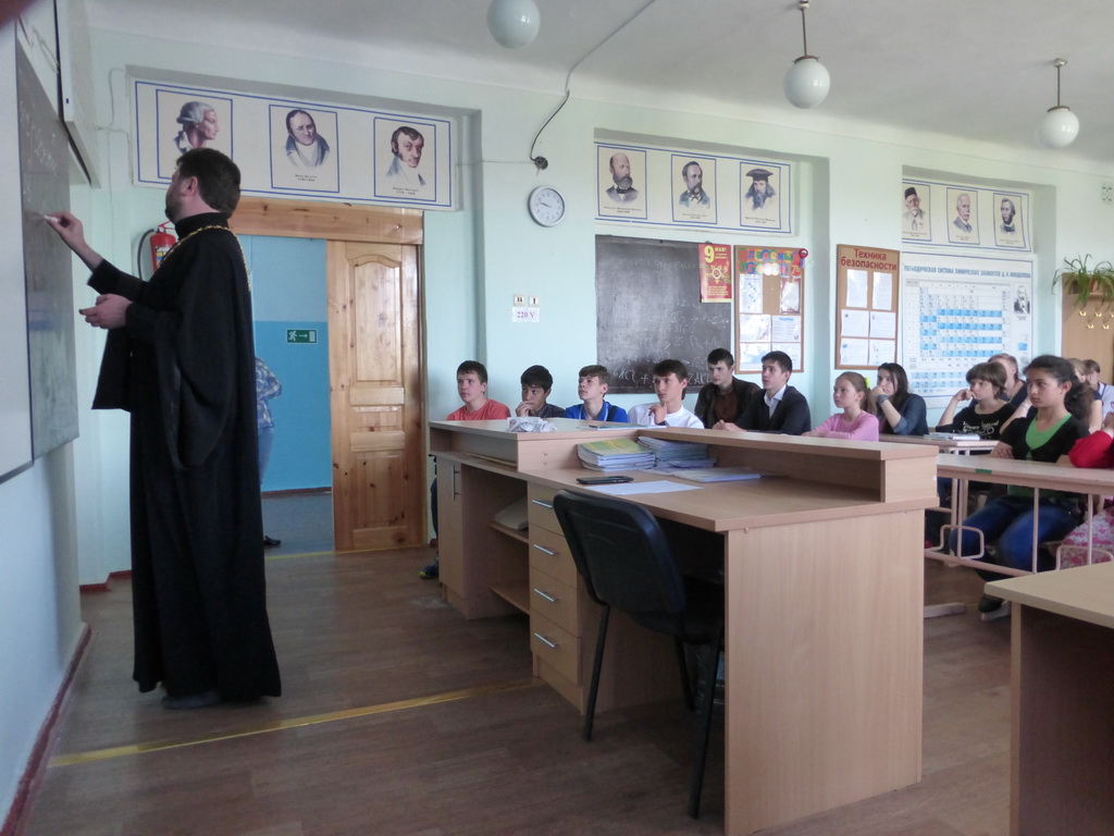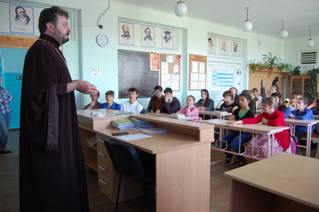 26 мая в Средней школе №1 станицы Зеленчукской благочинный Южного Карачаево-Черкесского церковного округа протоиерей Евгений Субтельный провел урок, посвященный сравнительному анализу значения некоторых церковнославянских слов, применительно к современному русскому языку.
