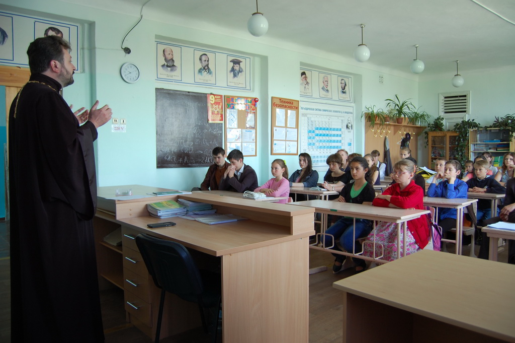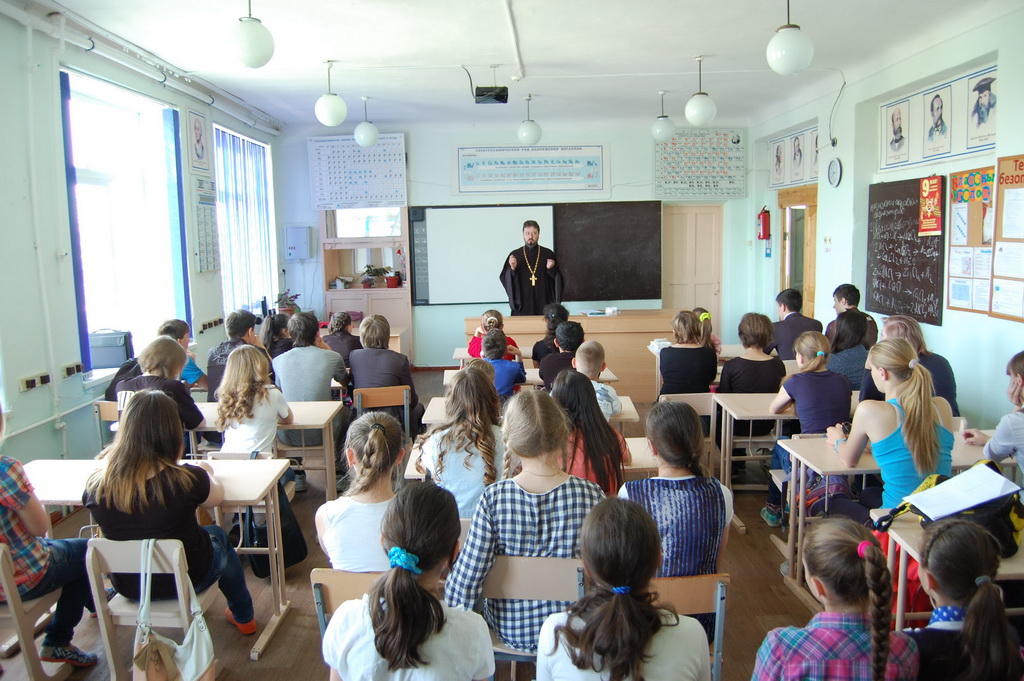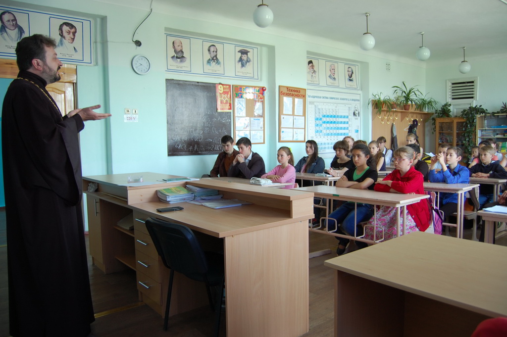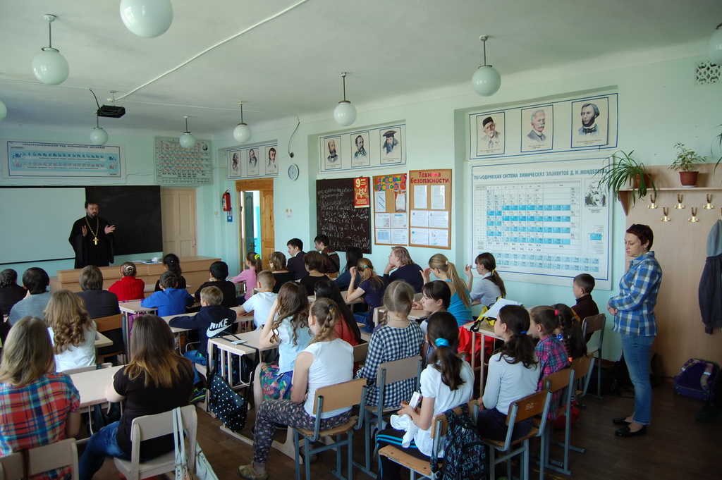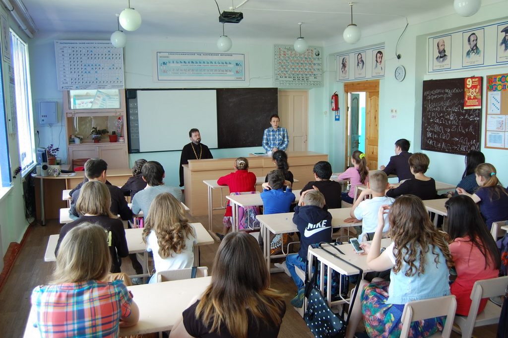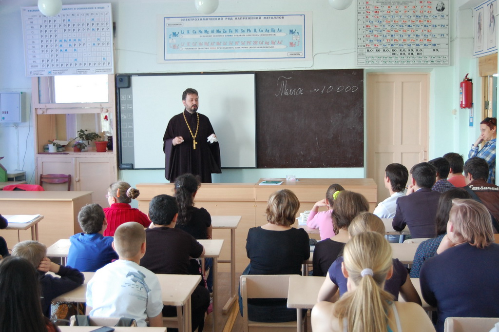 26 мая в Средней школе №1 станицы Зеленчукской благочинный Южного Карачаево-Черкесского церковного округа протоиерей Евгений Субтельный провел урок, посвященный сравнительному анализу значения некоторых церковнославянских слов, применительно к современному русскому языку.