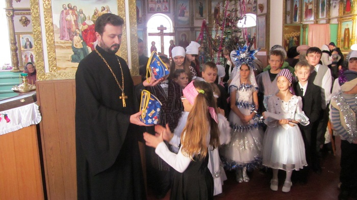 В завершение праздника благочинный церквей южного Карачаево — Черкесского округа,настоятель храма Святых Первоверховных апостолов Петра и Павла станицы Зеленчукской иерей Евгений Субтельный поздравил всех учащих, учащихся, родителей и прихожан с этим Светлым праздником Рождества, с Новолетием нового 2012 года, пожелал всем мира, новых благих дел, здоровья и благоденствия. И, конечно же, вручил всем учащимся рождественские подарки, а ребятам, которые отличились в конкурсе рисунков к Рождеству красочные призы.